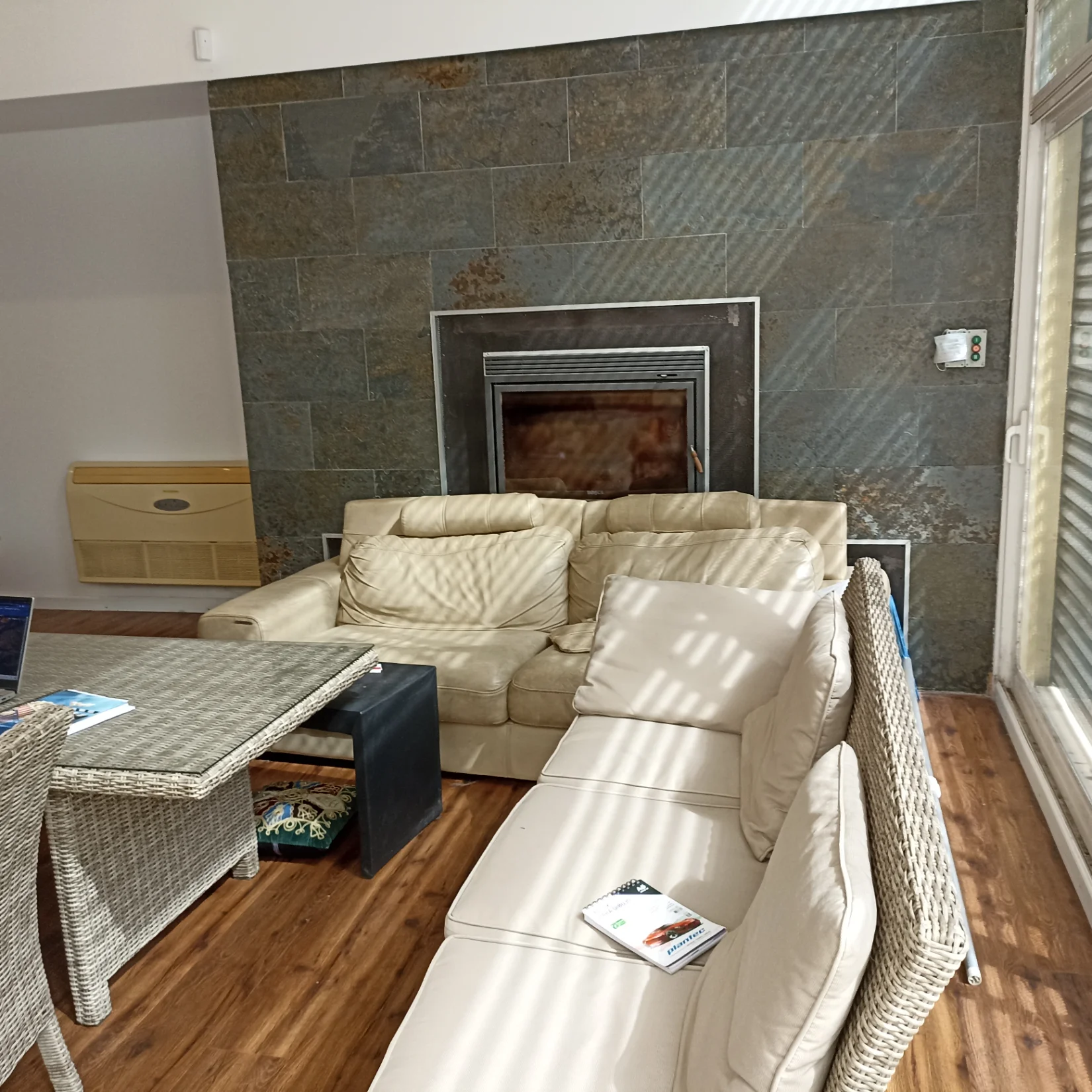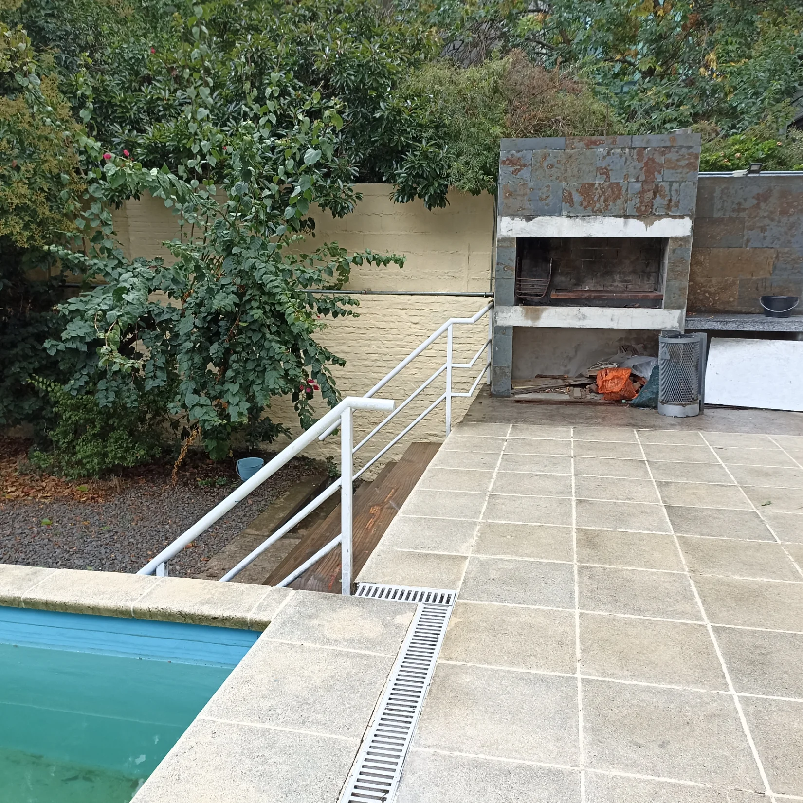 PB son 180m2: Frente con jardín y cerramiento perimetral. Desde allí se accede a hall de entrada que comunica a escritorio que da al frente y hacia el otro lado hay un espacioso living comedor (de doble altura lo que da una sensación de mucha amplitud), grandes ventanales al fondo y frente (aberturas DVH), estufa a leña de alto rendimiento, cocina integrada que comunica a terraza hacia el fondo, alacena, baño social. Terraza con parrillero y piscina que da hacia gran fondo verde.