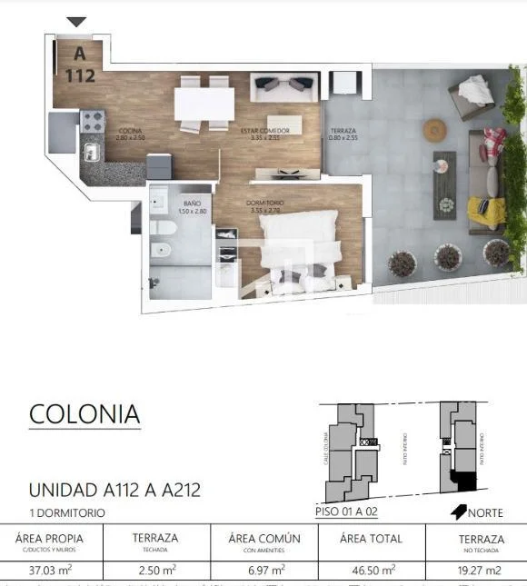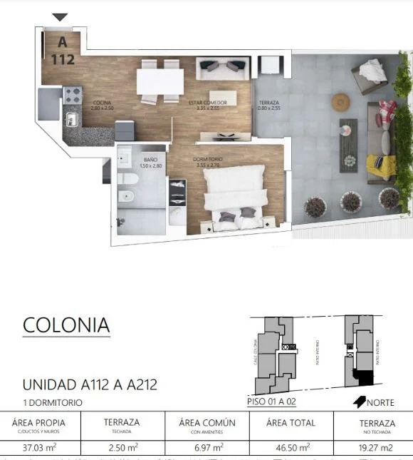 Área Interna 37 m² | Terraza Cubierta 2,5 m² | Terraza Tipo Patio 19,3 m².