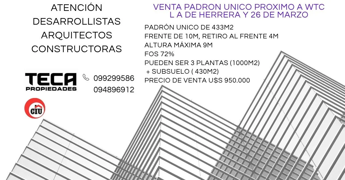 Padrón Único a la venta de 433 m2. Sobre Luis Alberto de Herrera e Iturriaga, todos los servicios cerca. Ideal para desarrollistas, constructores, arquitectos. Frente: 10 m Retiro al frente 4 m Altura máxima 9 m FOS 72% Pueden ser 3 plantas (1000m2) + subsuelo de 430m2 Precio de venta U$S 950.000 Afiliados a CIU Teca Propiedades