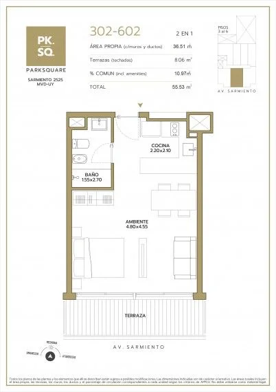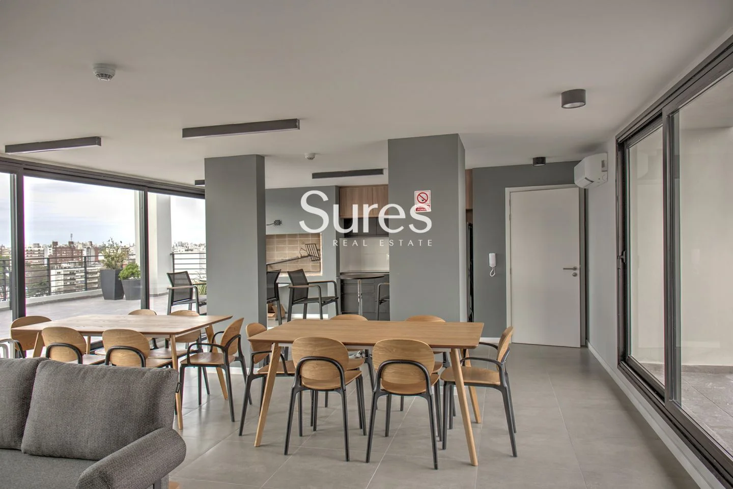 Se desarrolla en 31 m2 interiores y 7 m2 de terraza. Superficie APPCU 47 m2. Cuenta con un amplio espacio con salida a terraza que integra el living, dormitorio y cocina con barra, placar sobre y bajo mesada. Un baño completo.