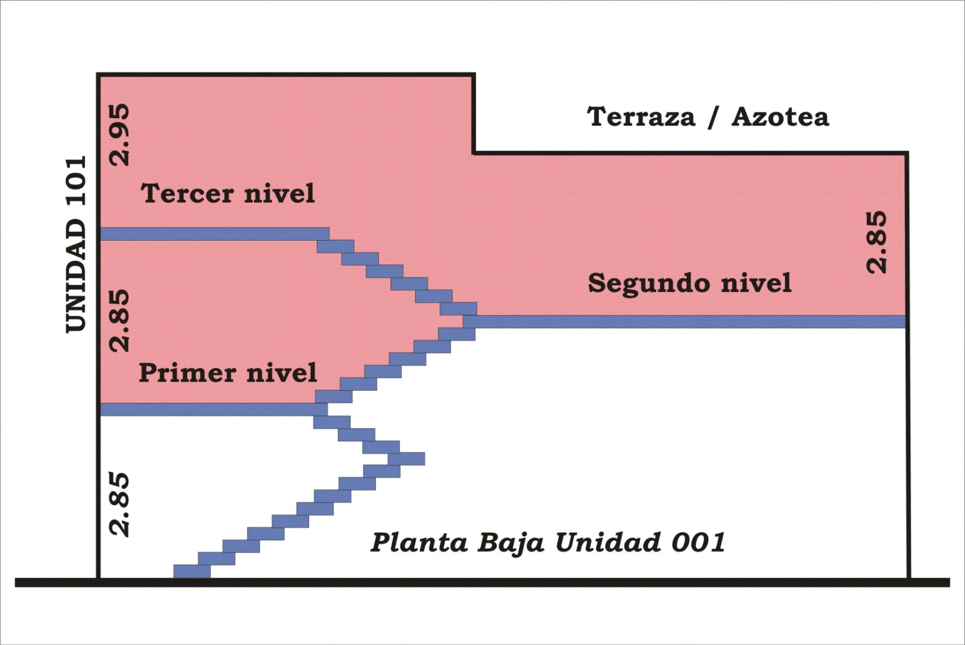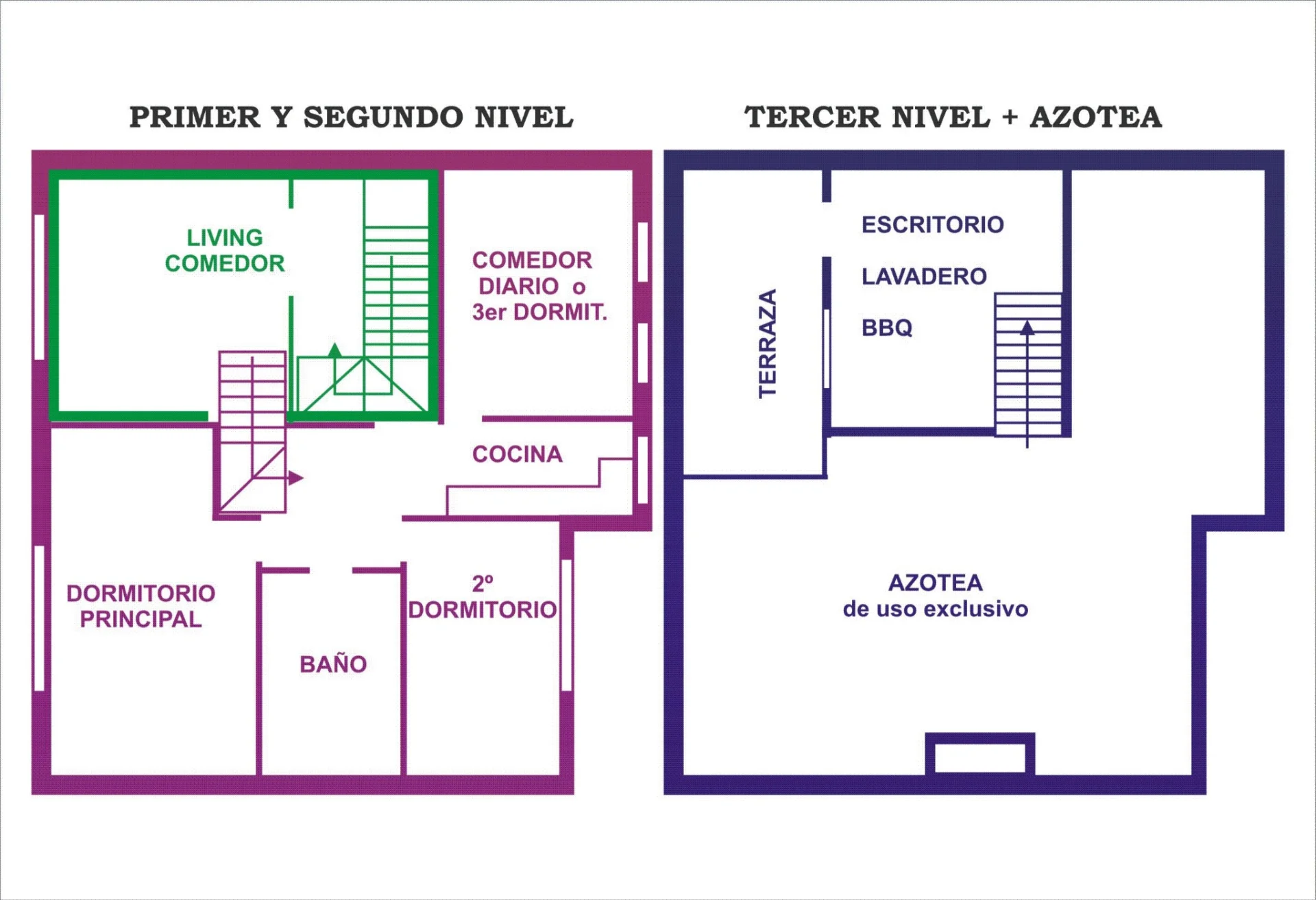 Se desarrolla en 3 plantas (que se sube de manera consecutiva de a medio piso) por escalera.
