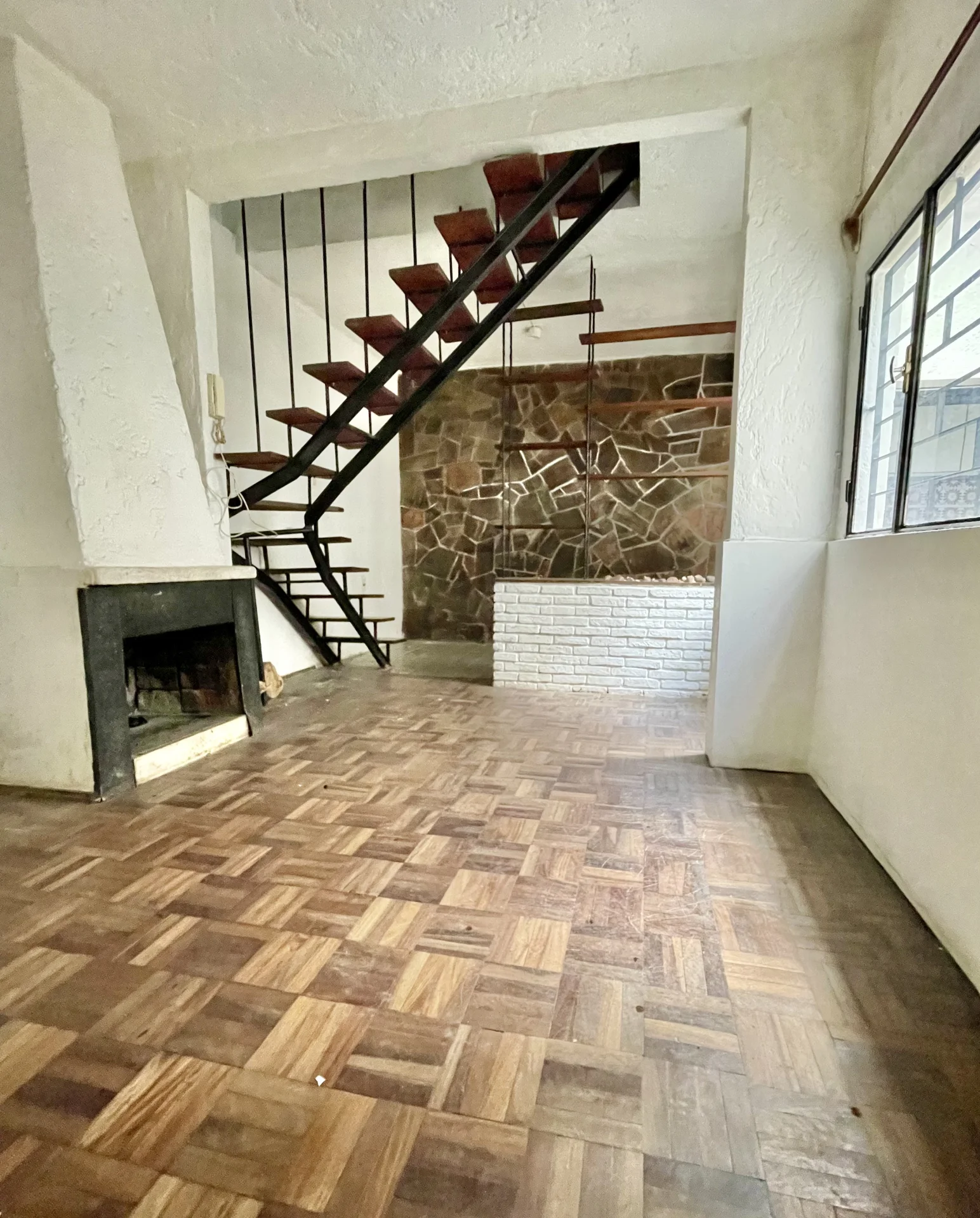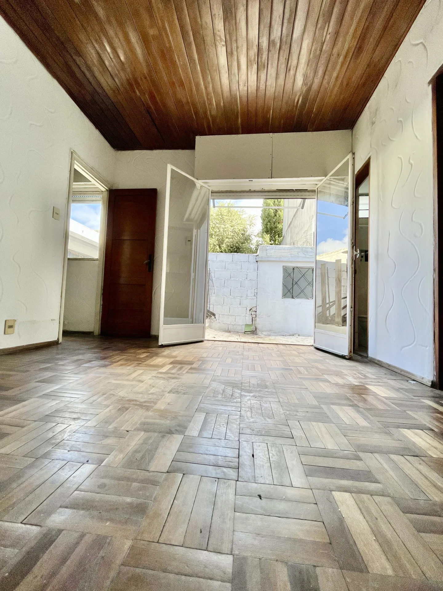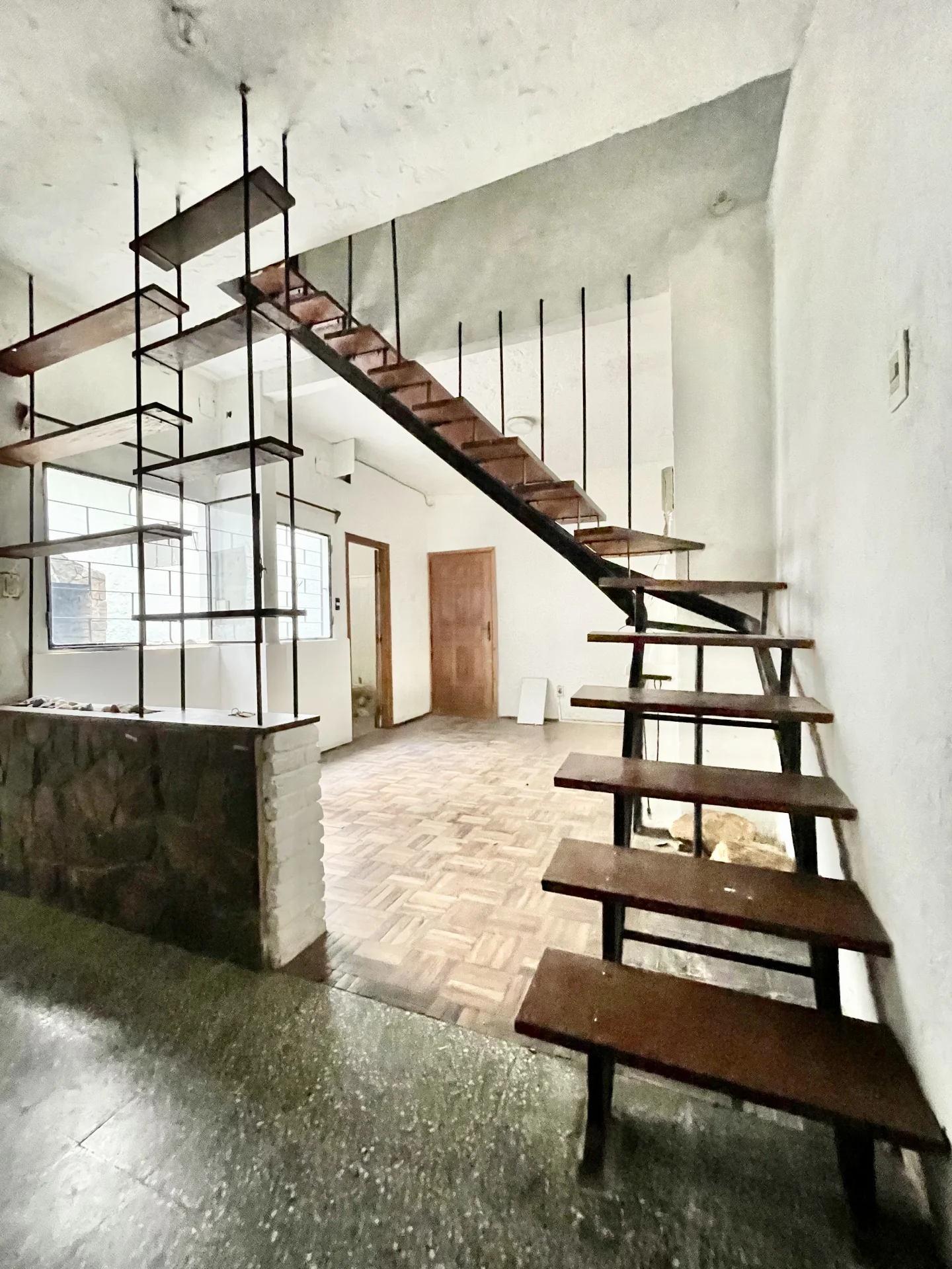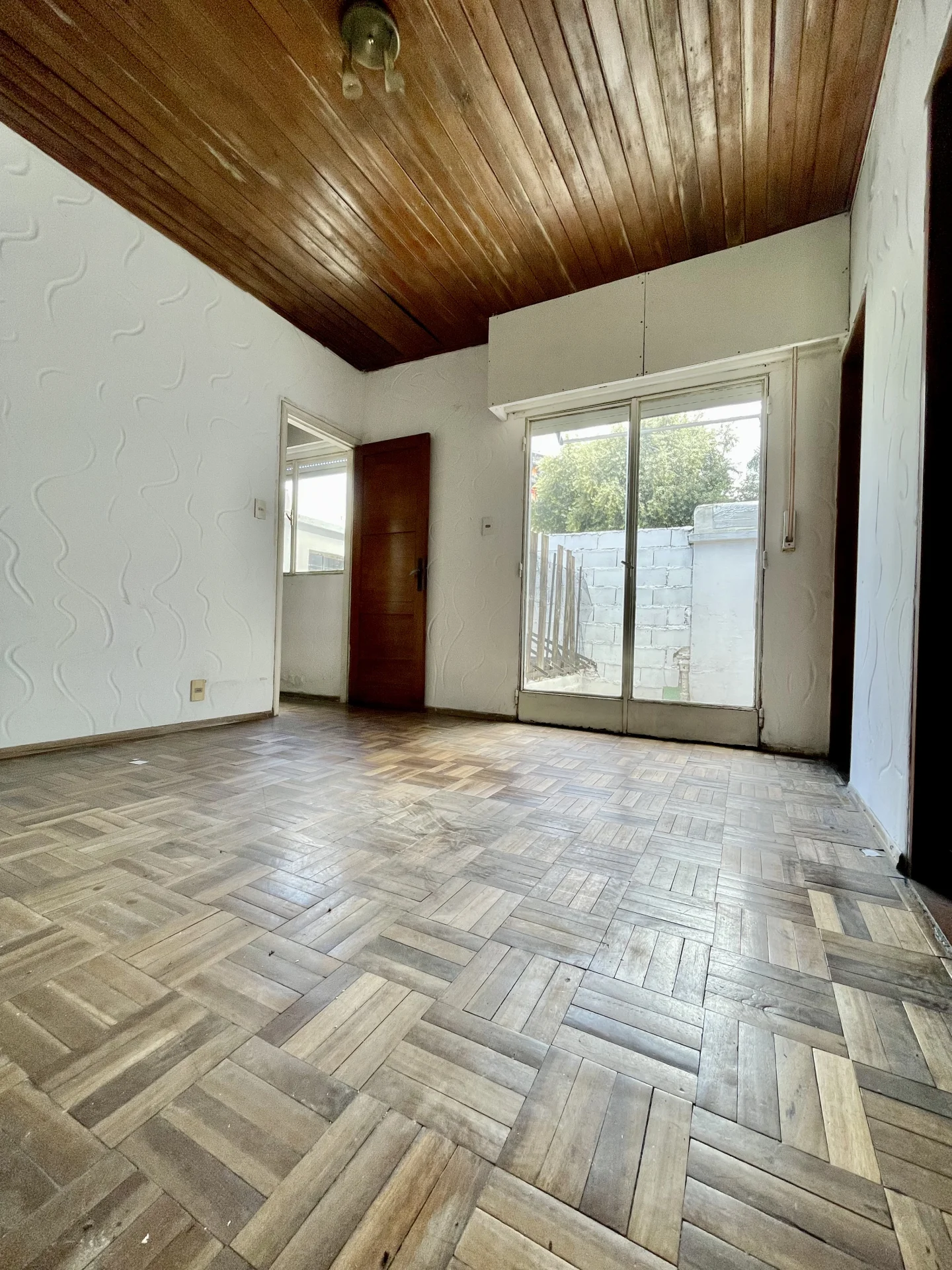 Amplio living comedor con estufa a leña pisos parquet un baño completo y cocina definida con estar integrado y salida al patio amplio con parrillero y sol del Norte en todos los ambientes .