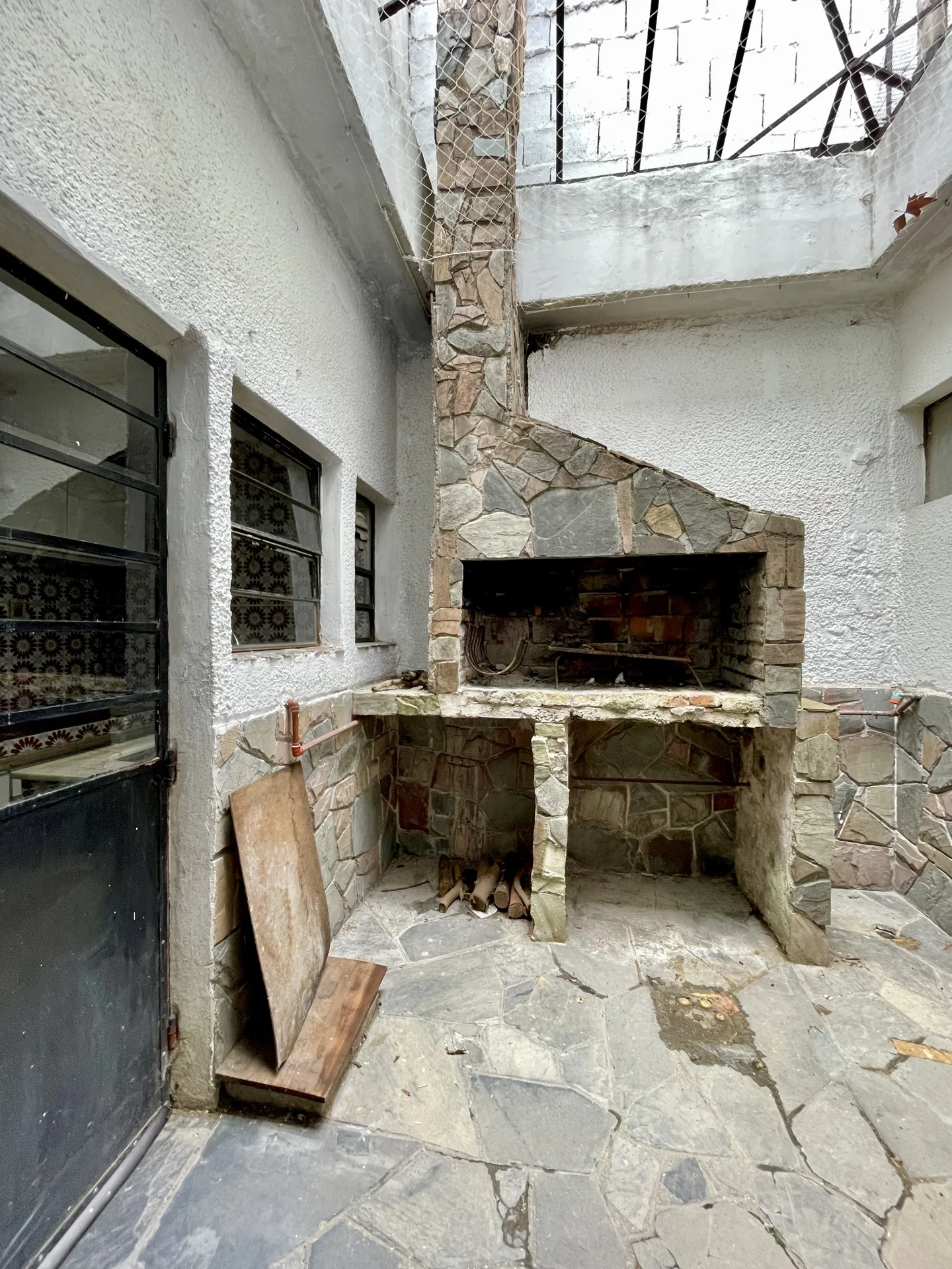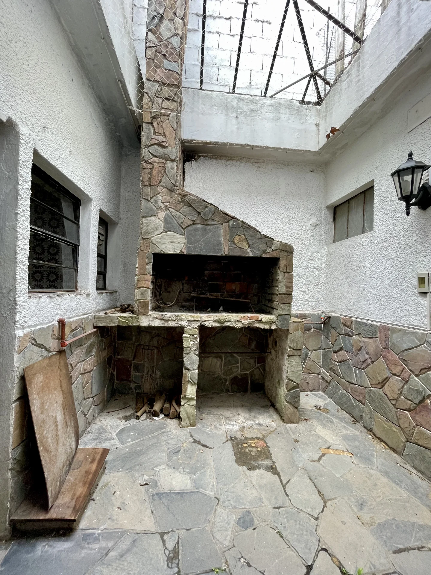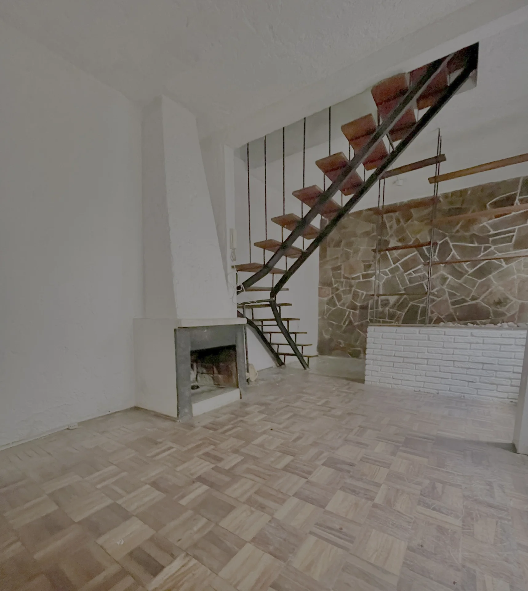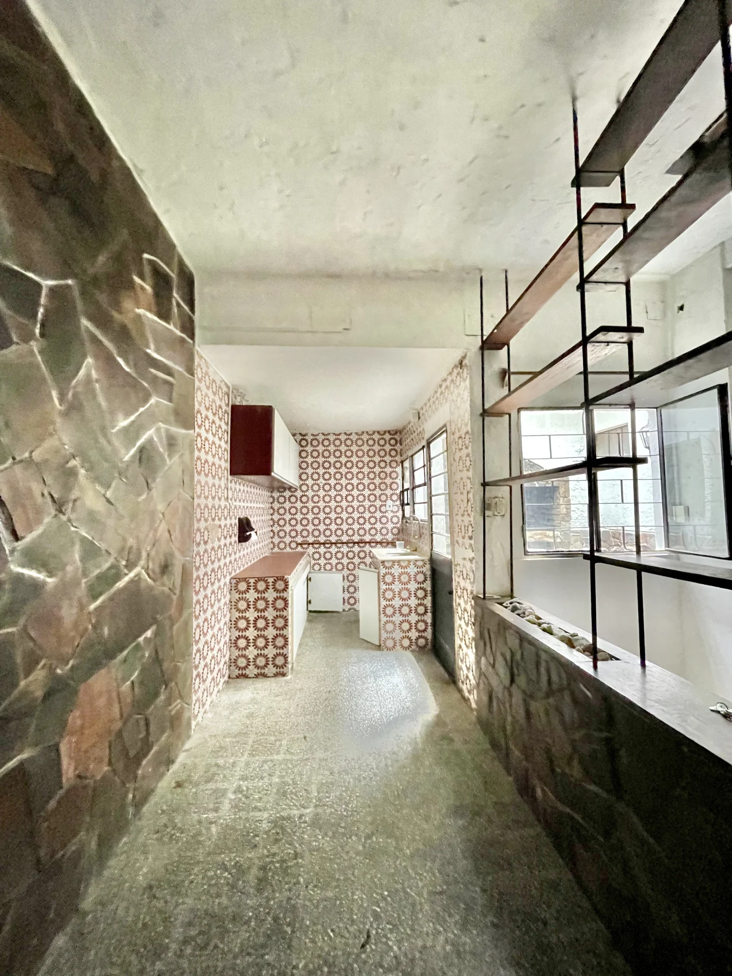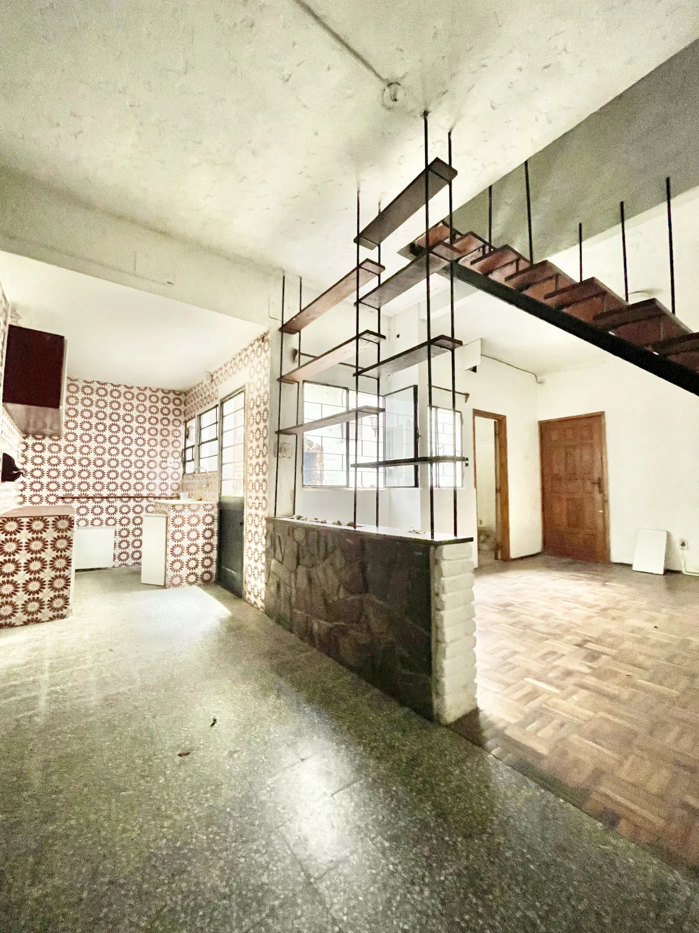 Amplio living comedor con estufa a leña pisos parquet un baño completo y cocina definida con estar integrado y salida al patio amplio con parrillero y sol del Norte en todos los ambientes .