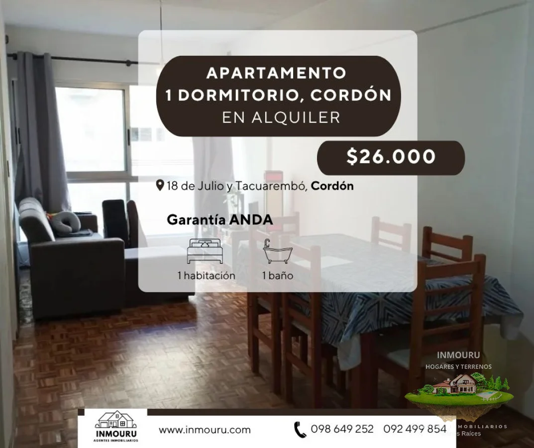 Se alquila apartamento en Cordón, 18 de Julio y Tacuarembó 1 dormitorio Baño Cocina integrada, living comedor Garantía ANDA Alquiler $26.000 Honorarios profesionales 1 mes de alquiler Agente Lorena Referencia Interna : Tera-1586