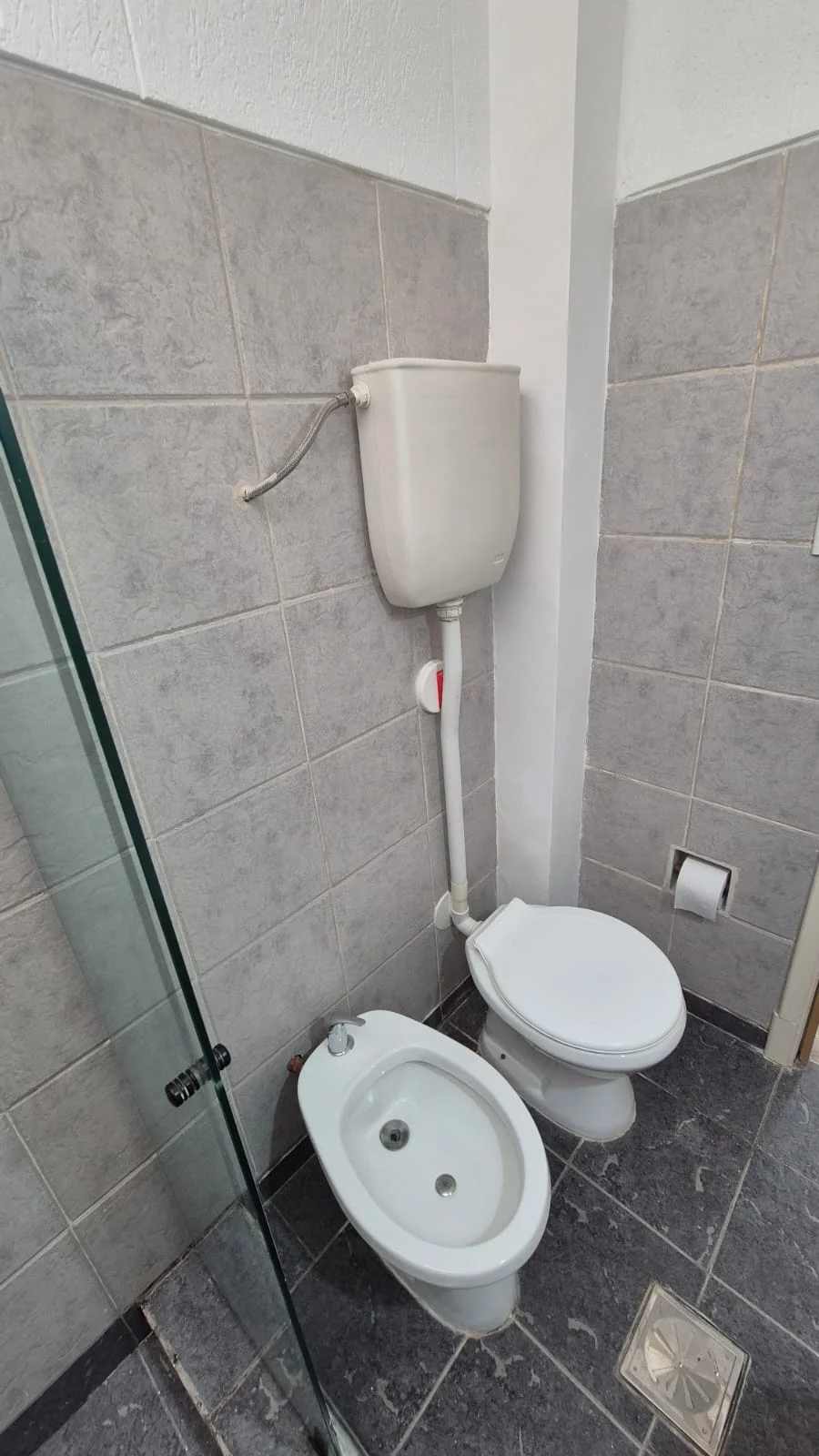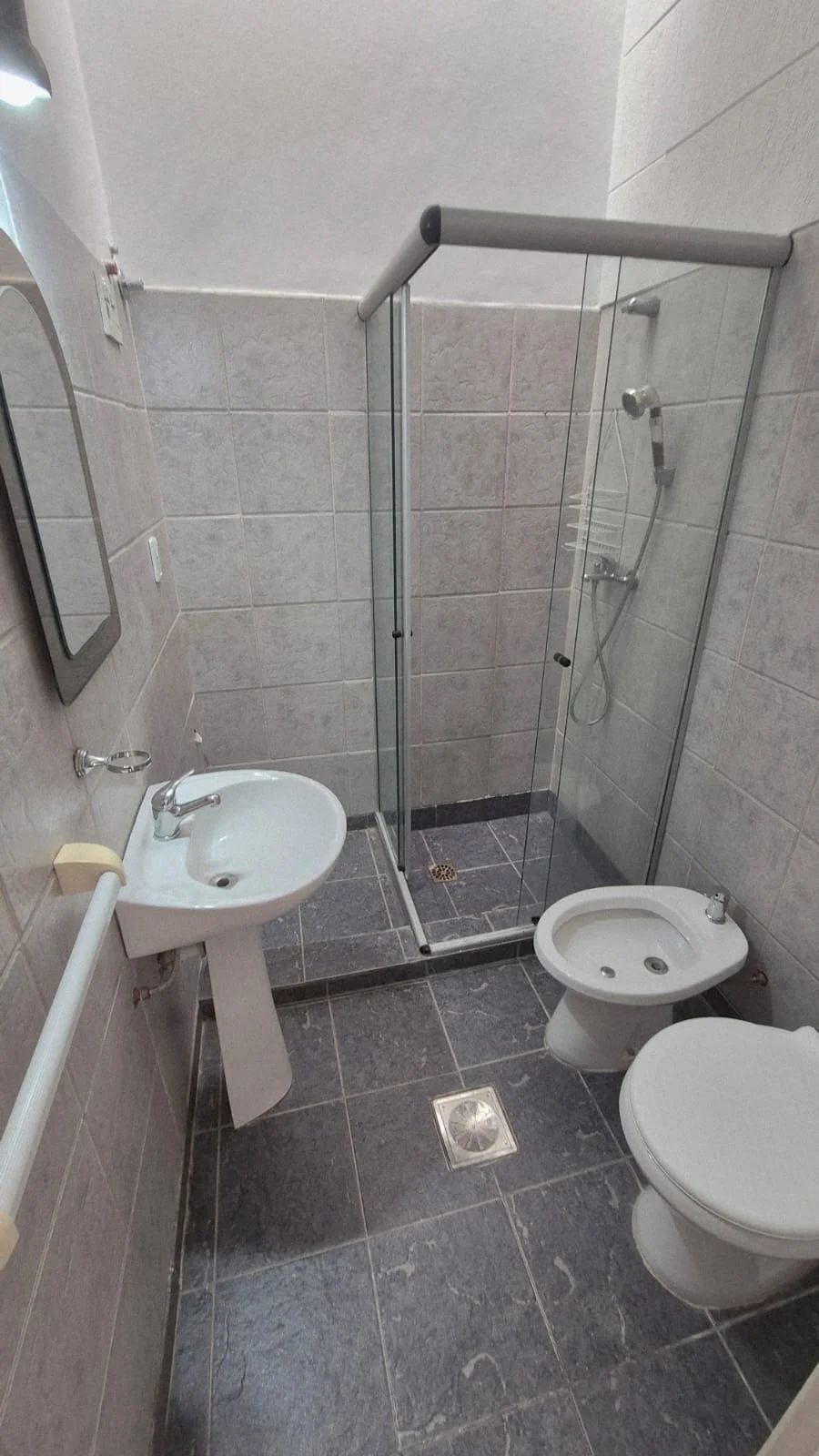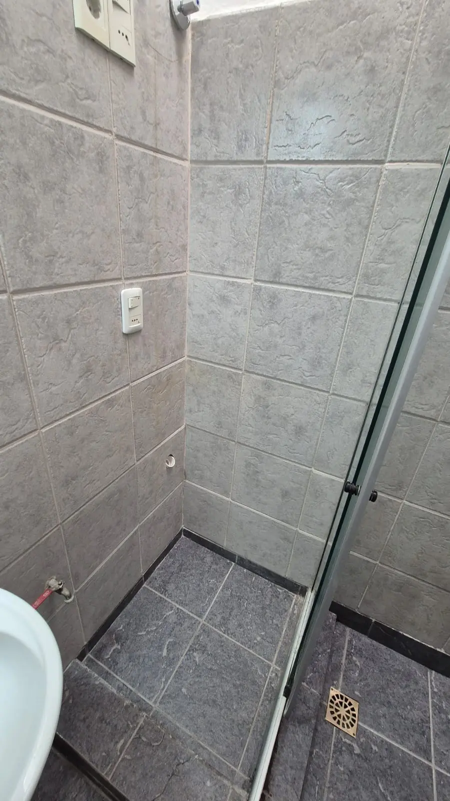Baño con mampara, extractor, monocomandos y espacio para secarropas.