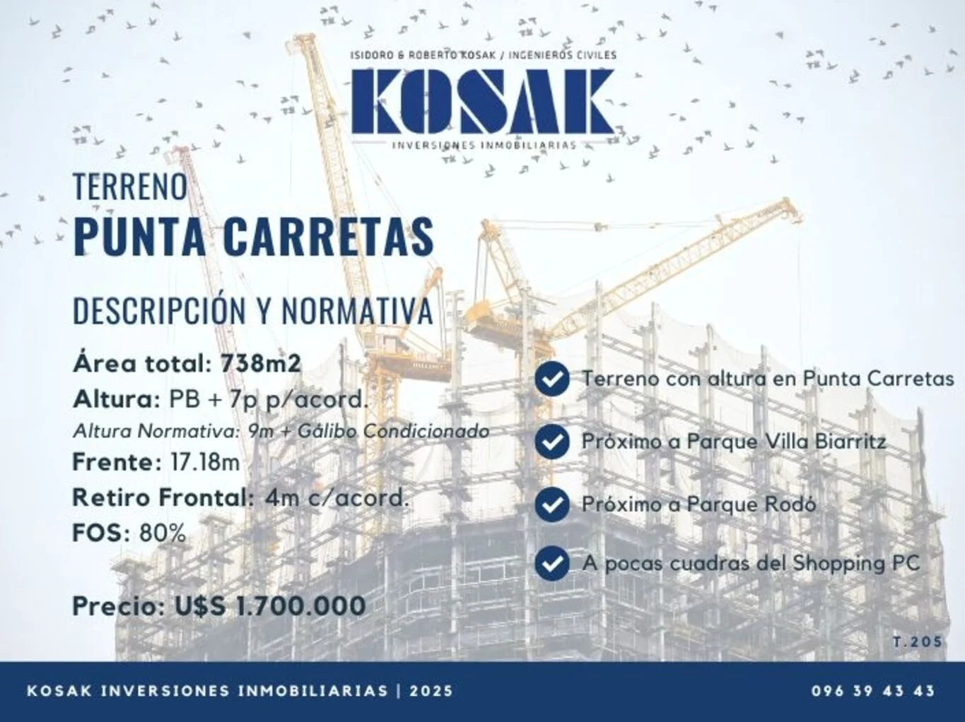 KOSAK INVERSIONES INMOBILIARIAS - TERRENOS Hermoso terreno con 17 metros de frente en Punta Carretas. Próximo al Parque Villa Biarritz y al Parque Rodó. A pocas cuadras de Punta Carretas Shopping. Área total: 738m2 Altura: PB + 7p por acord. (Prof. 14m aprox.) Altura Normativa: 9m + Gálibo Condicionado Frente: 17.18m Retiro Frontal: 4m c/acordamiento FOS: 80% Por consultas comunicarse con Arq. Valentina Kosak - 096394343
