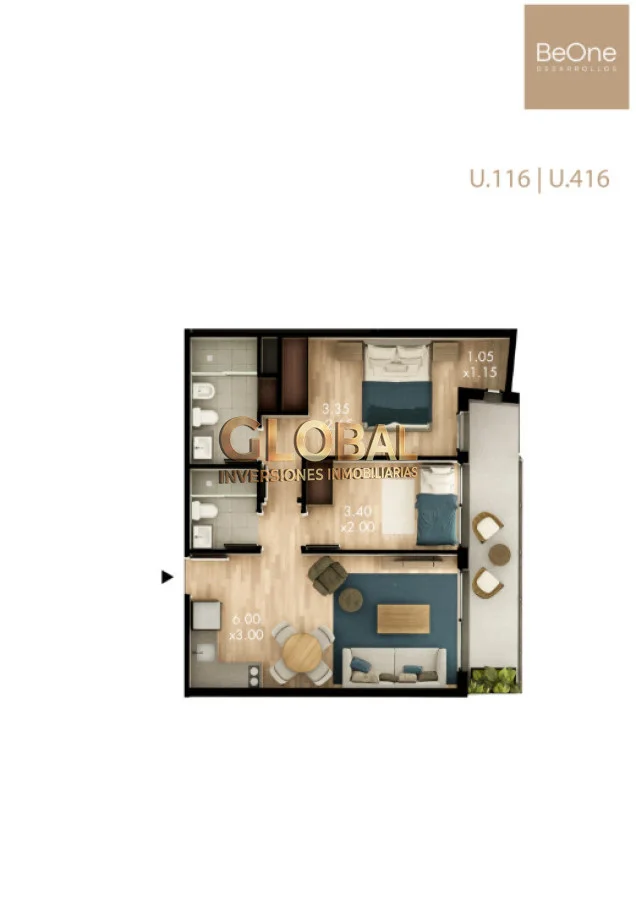 Unidad de 2 dormitorios y 2 baños (principal en suite), ubicada en piso 2, con terraza privada que aporta luz, aire y calidad de vida.