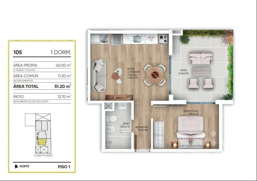 Hermoso apartamento de 1 dormitorio con cómodo patio privado.
