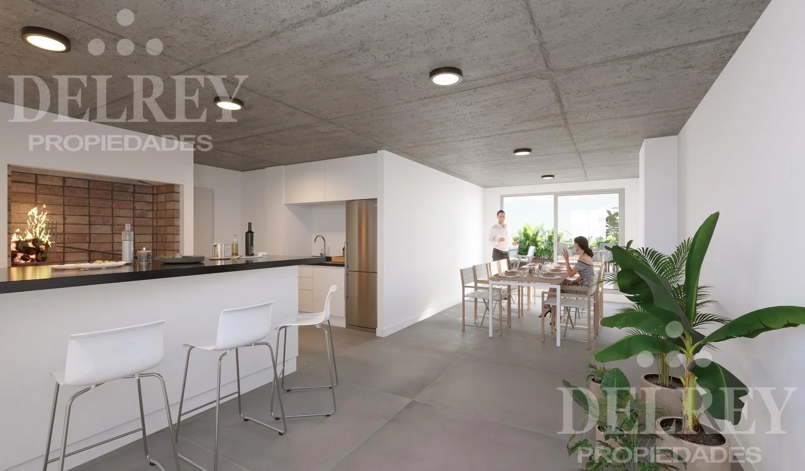 Salón cerrado equipado con mobiliario, parrillero, kitchenette, una isla alta, y una amplia terraza al