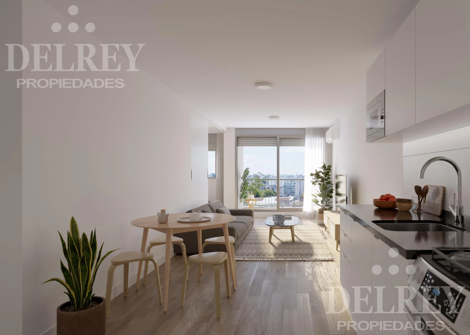 Espacioso living comedor con ventanal hacia una cómoda terraza soleada.