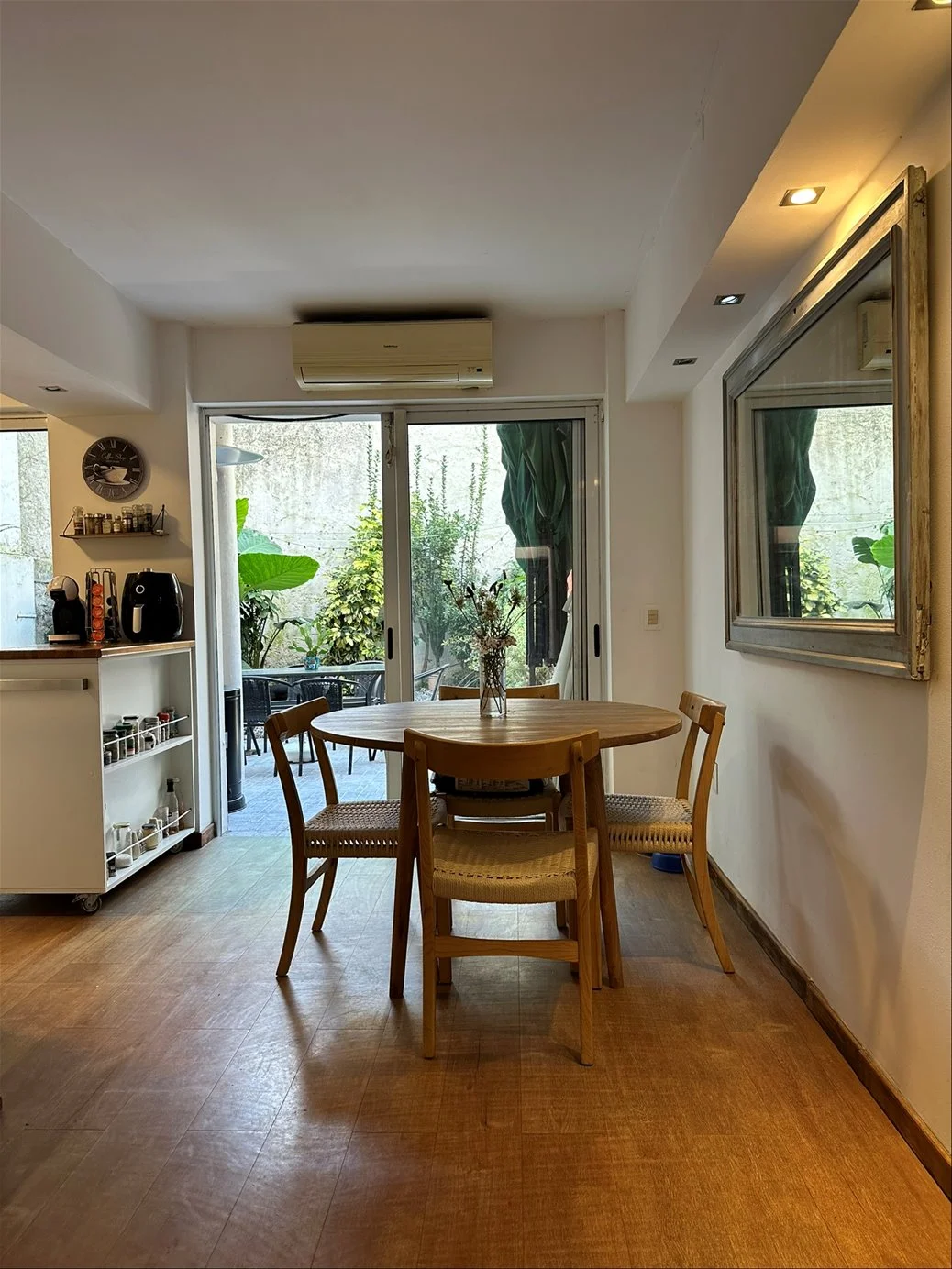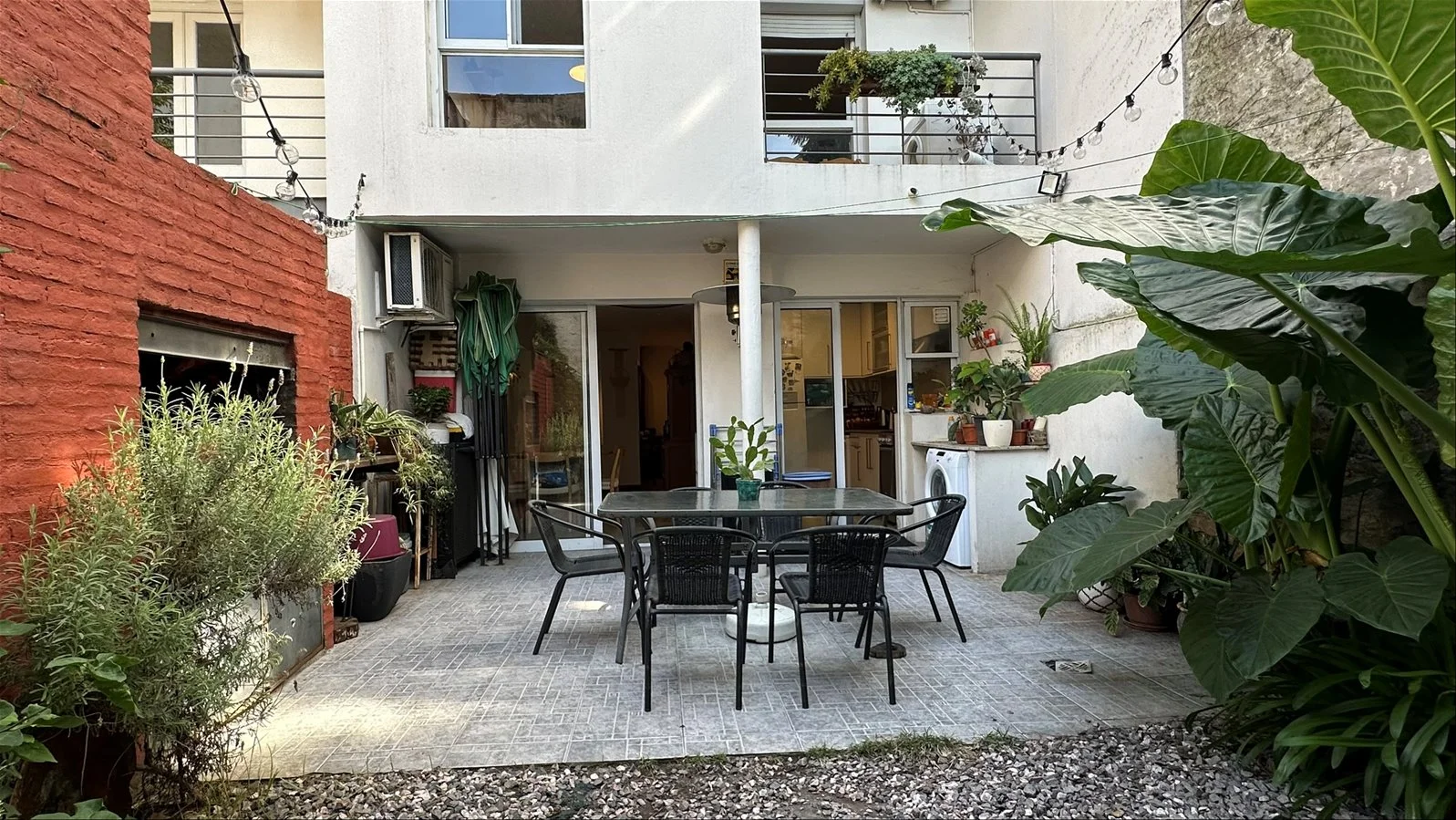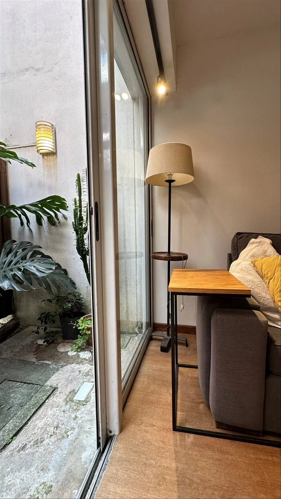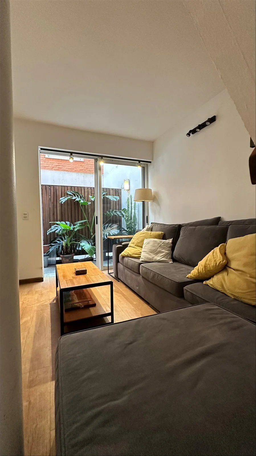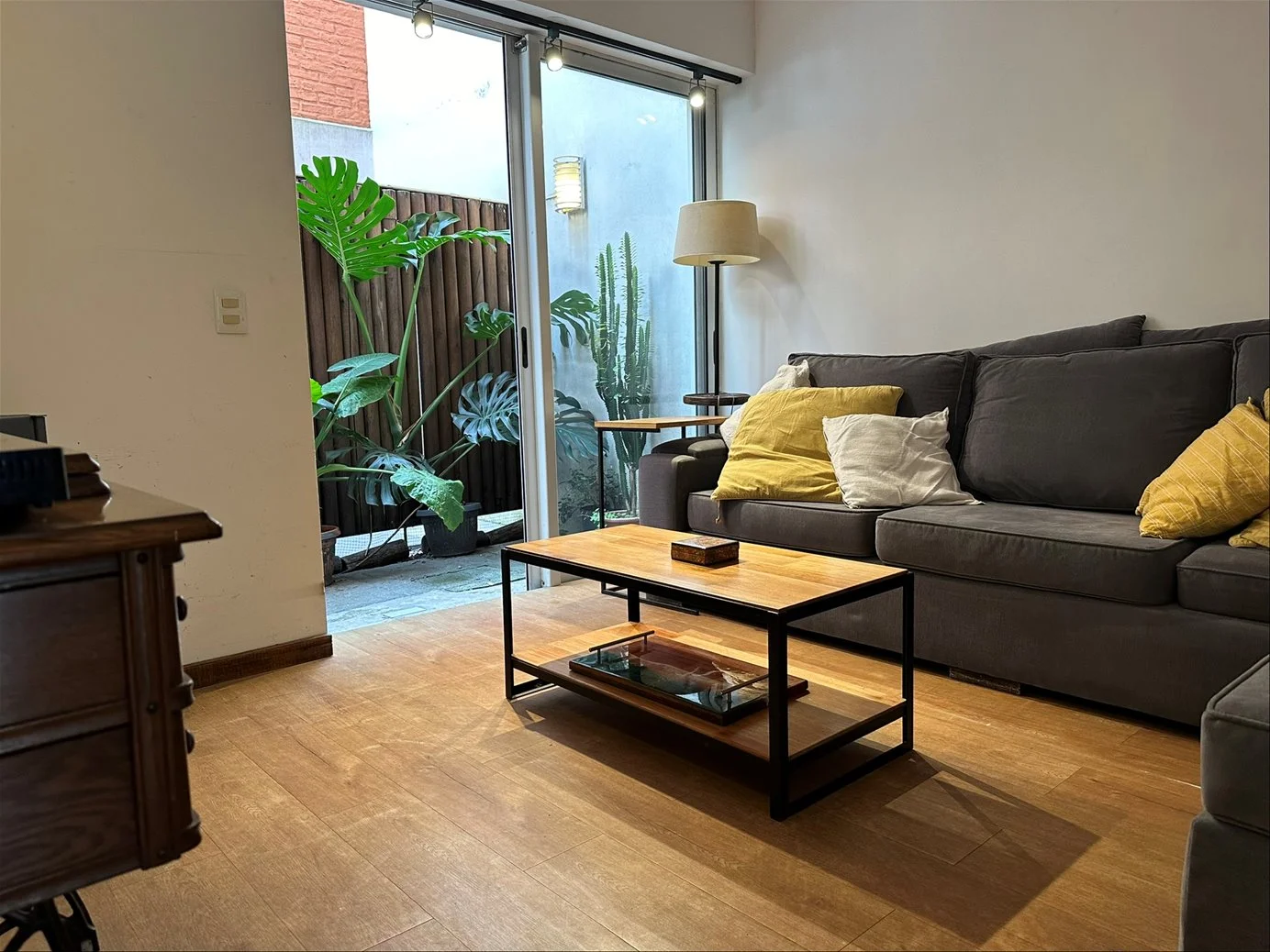 Living, comedor y cocina semi integrada con salida a patio de uso exclusivo con parrillero, estufa a leña de alto rendimiento y equipo de AA. Baño social.