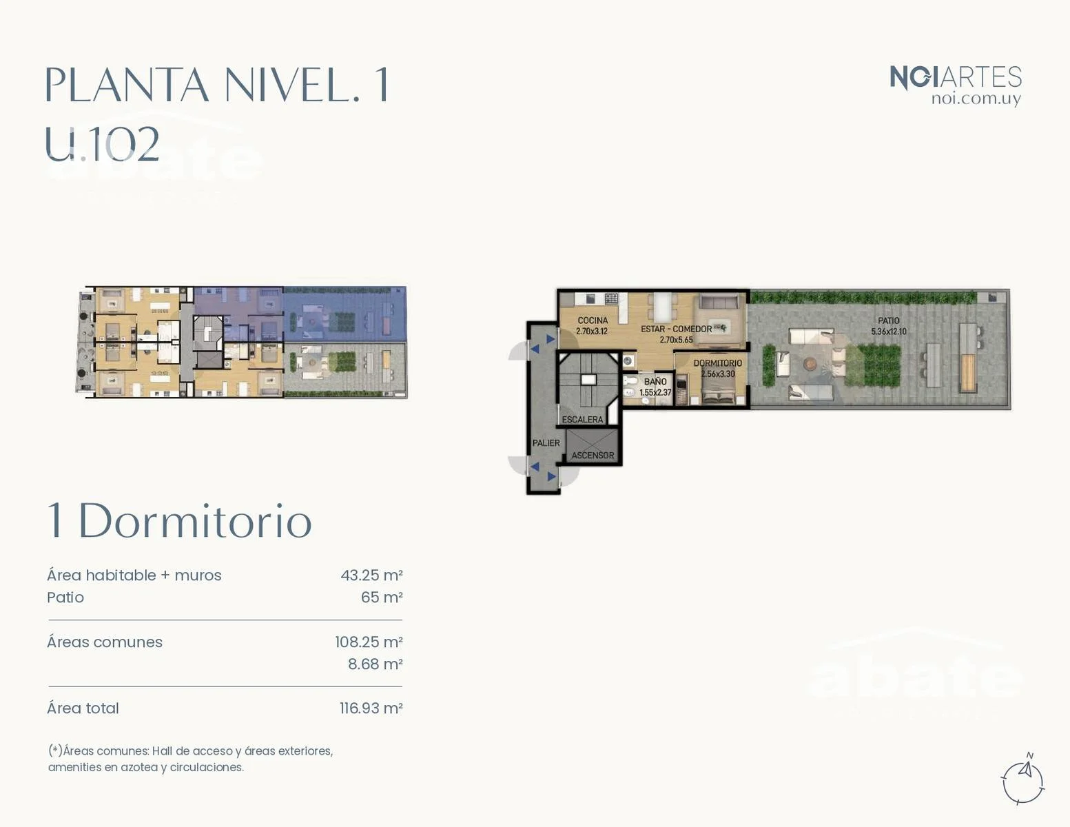 La unidad cuenta con cocina integrada equipada con bajo mesada e isla, amplio living comedor que se extiende un patio de uso exclusivo de 65 metros cuadrados generando mayor sensación de amplitud. Dormitorio con placard. Baño completo
