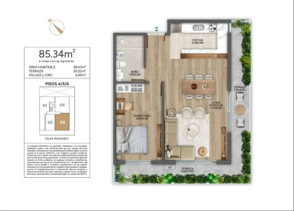 Venta apartamento de 1 dormitorio y gran terraza en Punta Carretas proximo a Sarmiento y 21 de Setiembre