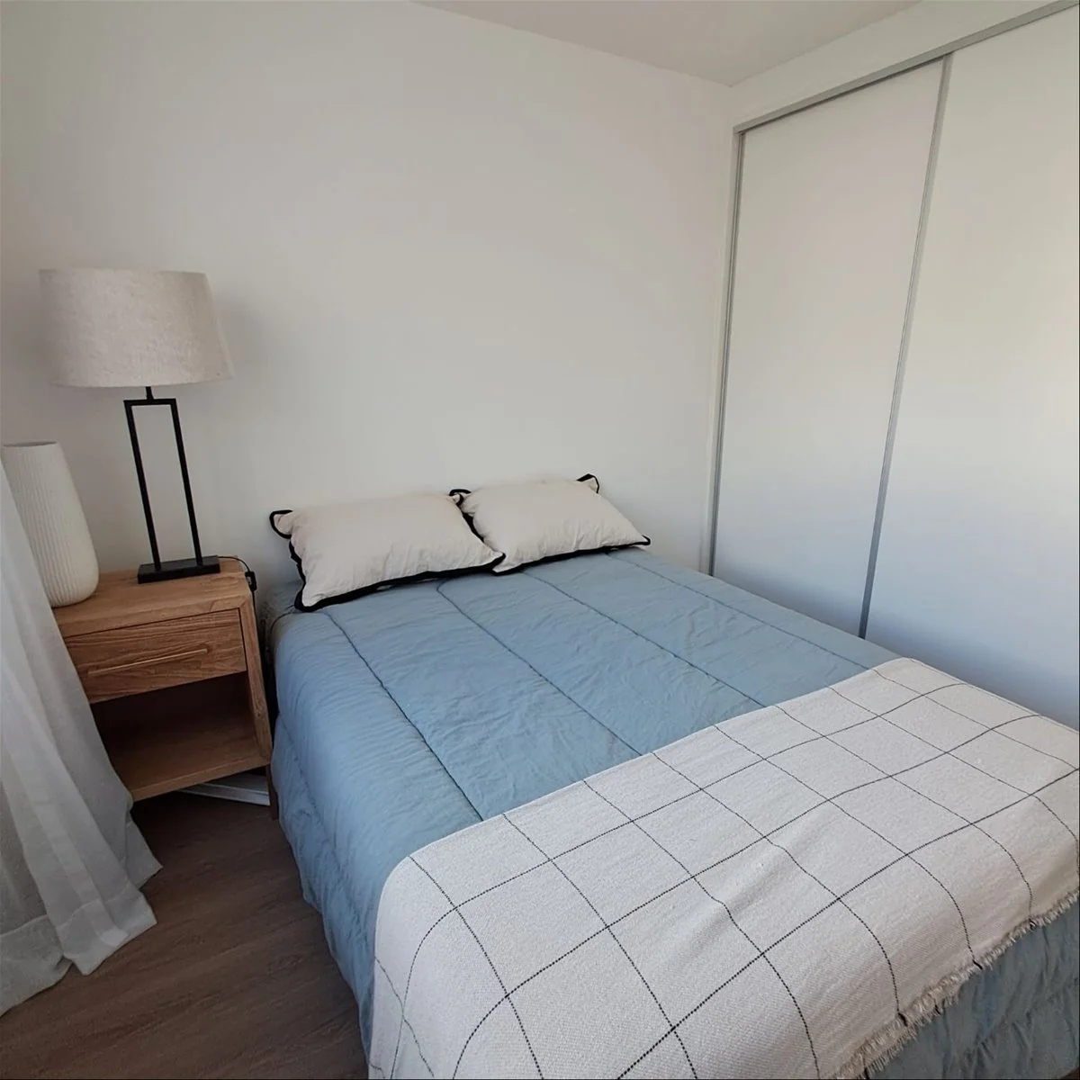 - Piso de tablas de vinílico simil madera y zócalo blanco en interiores.