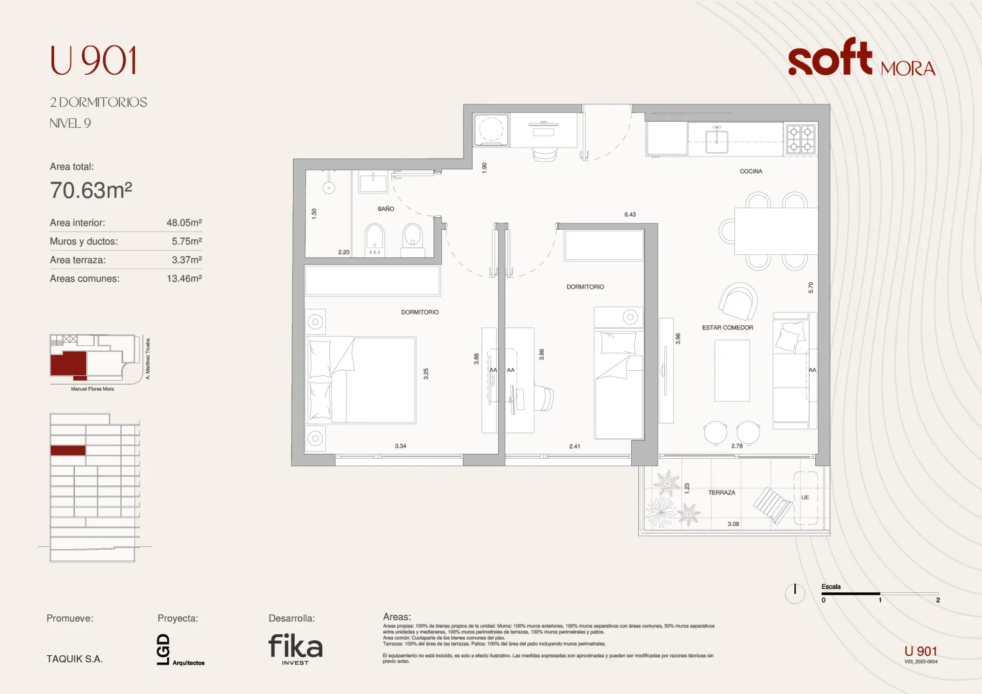SOFT MORA – CORDÓN SUR Se trata de una unidad de 70,6m2 totales con 48m2 interiores muy bien distribuidos que hacen de esta unidad una excelente opción para quienes buscan un hogar cómodo y funcional. Se desarrolla en un piso 9 y sus amplios ventanales de piso a techo con acceso al balcón regalan una hermosa vista despejada al Río de la Plata. ----------------------------------------------------------------------------------------------------------------------------------------------------- Soft Mora: edificio de diseño contemporáneo, con personalidad propia y en una ubicación estratégica a pasos de 18 de Julio, la Intendencia de Montevideo, facultades, centros culturales y la mejor oferta gastronómica de la ciudad. Con 34 apartamentos, este desarrollo combina funcionalidad, diseño y calidad constructiva que se ve reflejado desde que se accede al edificio, en el recorrido por sus pasillos que ofrecen un recorrido con luminosidad natural, hasta las unidades que cuentan con amplios balcones y ventanales de piso a techo, garantizando luz y ventilación natural. El edificio ofrece además 17 cocheras, acceso peatonal jerarquizado, espacio para bicicletas y un moderno sistema de montacoches para acceder a cocheras en subsuelo y nivel 1. Amenities de nivel en piso 12: - Solárium - Parrillero exterior - Zona lounge - Gimnasio - Laundry + Tender - Espacio de coliving con wifi Terminaciones destacadas: • Aberturas con DVH y lámina de control solar • Cerraduras digitales biométricas • Preinstalación de aire acondicionado • Cocina con mesada de granito y pileta en acero • Cocheras con previsión para instalación de cargadores de autos eléctricos Beneficios por la Ley de Vivienda Promovida (Ley 18.795): • Exoneración de ITP • Exoneración de IRPF/IRNR por 10 años • Exoneración del Impuesto al Patrimonio por 10 años Ideal para vivir, trabajar o invertir en una zona en constante crecimiento. FORMA DE PAGO: Semi contado (10% a la reserva – 70% al compromiso – 20% a al entrega) Pago estándar: 10% a la reserva – 30% al compromiso – 40% en cuotas en plazo de obra – 20% a la entrega. GASTOS DE OCUPACIÓN: 4.75% HONORARIOS FIKA: 3% + IVA Entrega 2027.