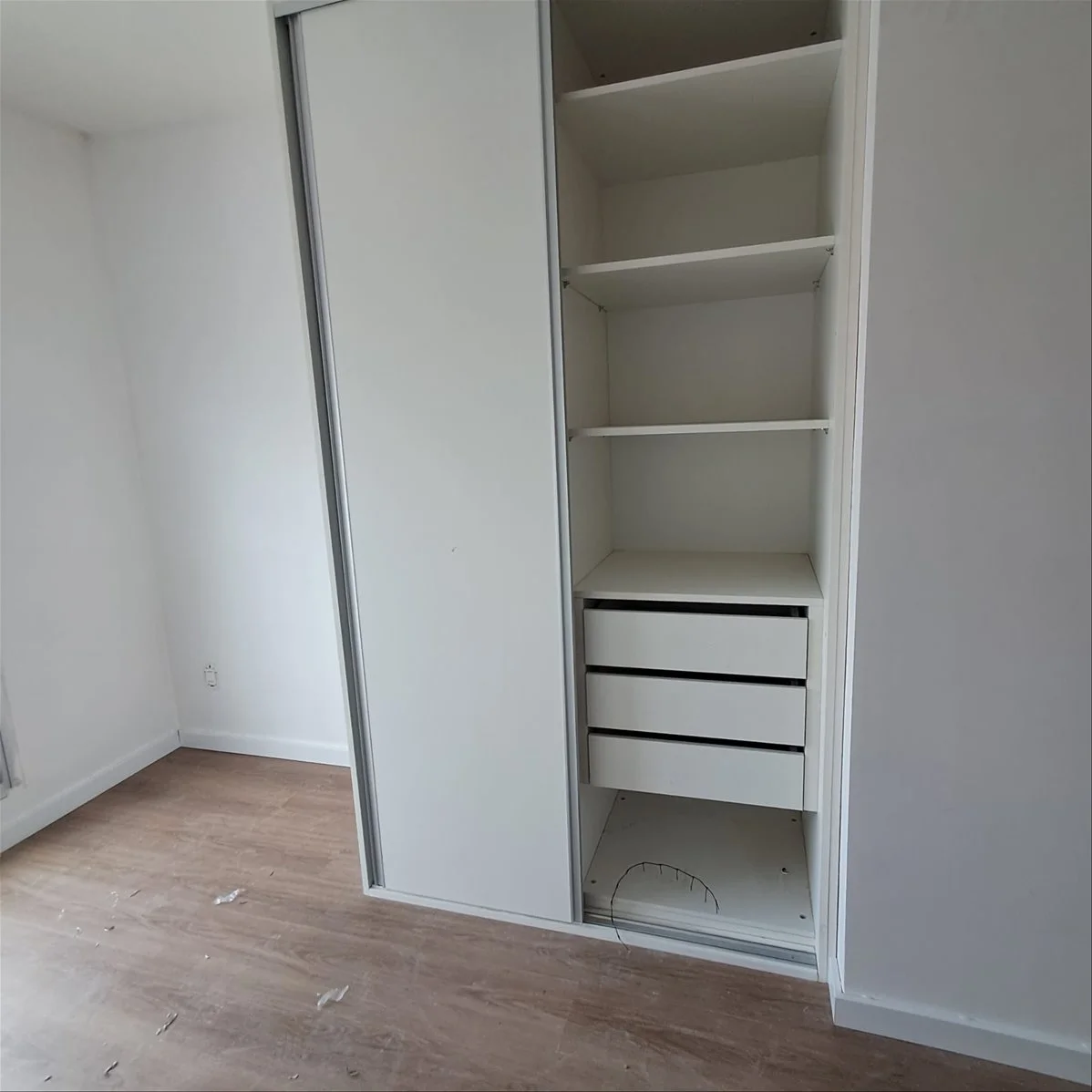 - Piso de tablas de vinílico simil madera y zócalo blanco en interiores.