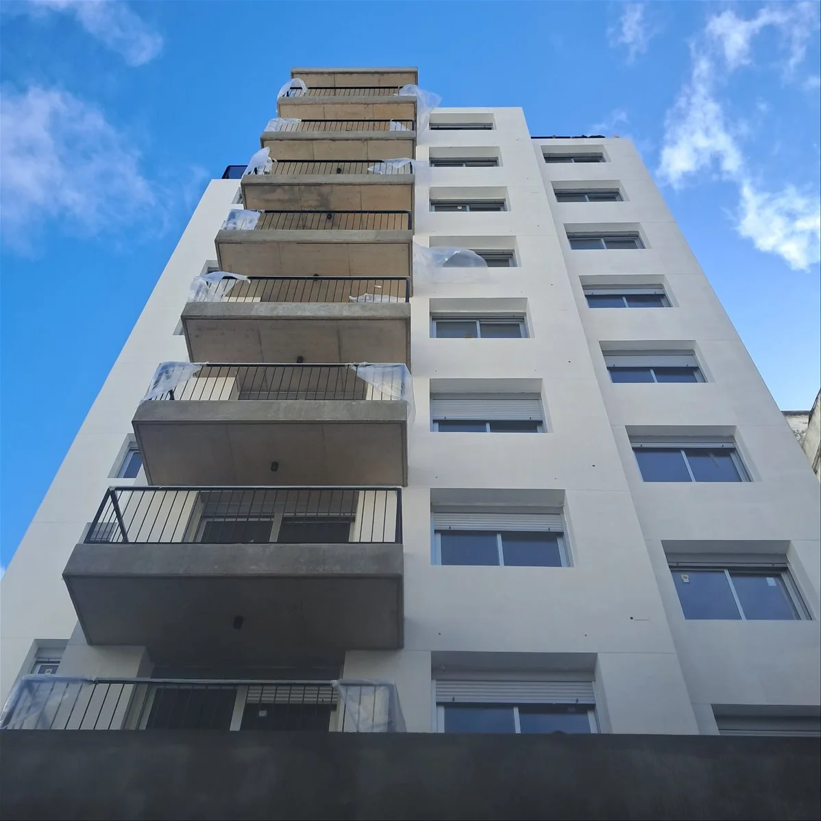 - Las unidades cuentan con terrazas o patios exclusivos, barandas metálicas verticales en balcones y divisorios entre balcones.