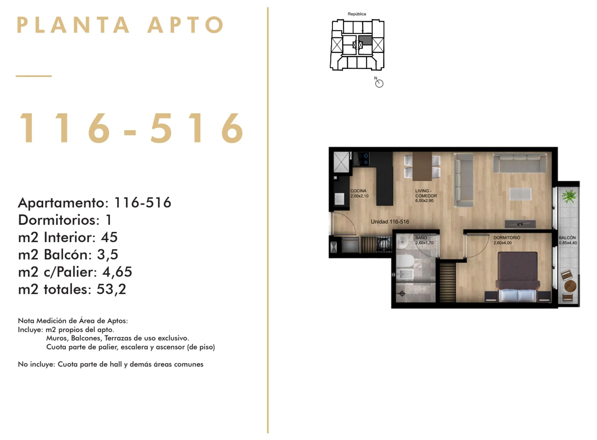 Corredor Responsable: - Contacto: Andrea Goldberg Se VENDE apartamento de 1 dormitorio y 1 baño, con cocina integrada y balcón. El mismo se encuentra ubicado en una zona con muchos servicios y locomoción. El apartamento se ubica en el piso 5, del edificio llamado VELVET. La cocina se entrega con muebles aéreos, bajo mesada, horno, anafe y campana extractora. El baño es completo y realmente muy amplio. Se entrega con aire acondicionado. Es un edificio de viviendas, con todos los beneficios de la LEY DE PROMOCIÓN. ALQUILADO EN $ 28.500 CON GARANTIA PORTO POR DOS AÑOS (a partir del 06/08/2025) Renta bruta 6,2% Espacio comunes innovadores: Cancha de multi deportes, circuito de atletismo, juegos para niños, espacio exterior para deportes de adultos, pet-friendlly, espacio co-work y piscina , en un enjardinado cuidadosamente diseñado. Al precio de la publicación corresponde anexar 4% de gastos de ocupación Comisión inmobiliaria 3% más IVA Compartimos con todos los colegas inmobiliarios Edificio construido por el arquitecto Lipatin. Cada Oficina es de propiedad, gestión y desarrollo independiente La presente publicación describe las características esenciales del inmueble, debiéndose consultar al responsable de la operación por la eventual actualización de las medidas, descripciones arquitectónicas y funcionales, servicios, impuestos, precios y demás información, cuyos valores son aproximados.