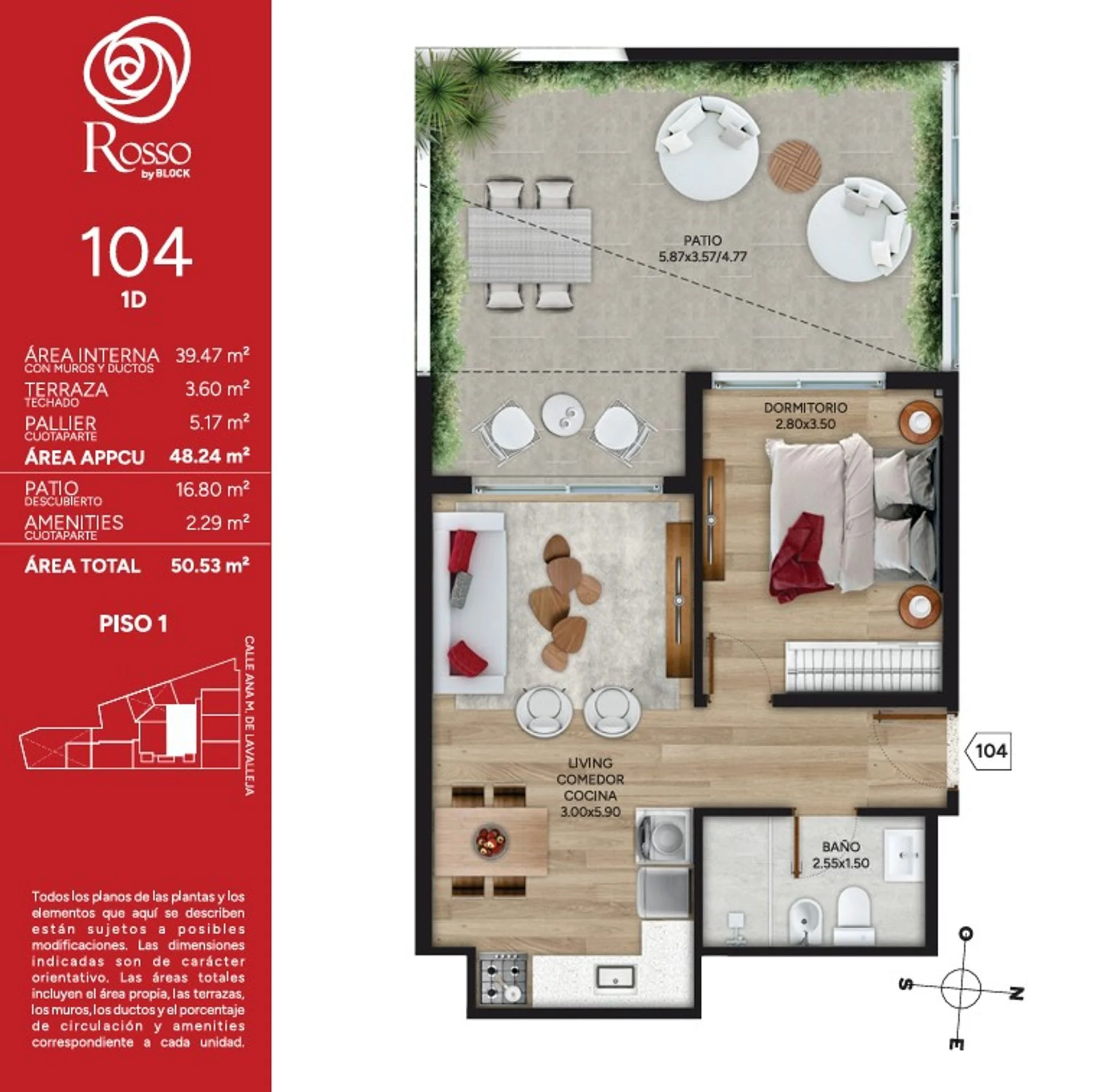 Corredor Responsable: - Contacto: Valeria Cruz Venta Apartamento 1 dormitorio con Patio Rosso Cordón Entrega Marzo 2028 ROSSO by Block es un lanzamiento único en Cordón Sur, ubicado estratégicamente en Ana M. de Lavalleja y Juan Paullier, se encuentra a pocos metros de la Avenida 18 de Julio y el Bulevar Artigas. Un proyecto de 10 pisos y 78 apartamentos. - Unidad de 1 dormitorio con amplia terraza - Precios especiales - 10% de descuento en las primeras unidades - Entrega marzo 2028 Podemos visitar showroom con mismas terminaciones en otro edificio avanzado. Amenidades de primer nivel: Terraza panorámica con vistas al skyline Gimnasio equipado Salón polivalente con parrillero interior Espacio exterior pergolado con parrillero Soporte para bicicletas y laundry con app Wi-Fi en áreas comunes Previsión para vehículos eléctricos Seguridad con cámaras CCTV y cerradura electrónica Beneficios fiscales – Ley de Vivienda Promovida Exoneración de ITP Exoneración de IRPF/IRAE en rentas por 10 años Exoneración de Impuesto al Patrimonio por 10 años Respaldado por BLOCK Más de diez proyectos construidos y exitosos garantizan trayectoria, confianza y solidez. Invertir en lanzamiento significa anticiparse y acceder a condiciones exclusivas que no vuelven a repetirse. ROSSO reúne todas las condiciones que un inversor busca con gran potencial de renta. Cada Oficina es de propiedad, gestión y desarrollo independiente La presente publicación describe las características esenciales del inmueble, debiéndose consultar al responsable de la operación por la eventual actualización de las medidas, descripciones arquitectónicas y funcionales, servicios, impuestos, precios y demás información, cuyos valores son aproximados.
