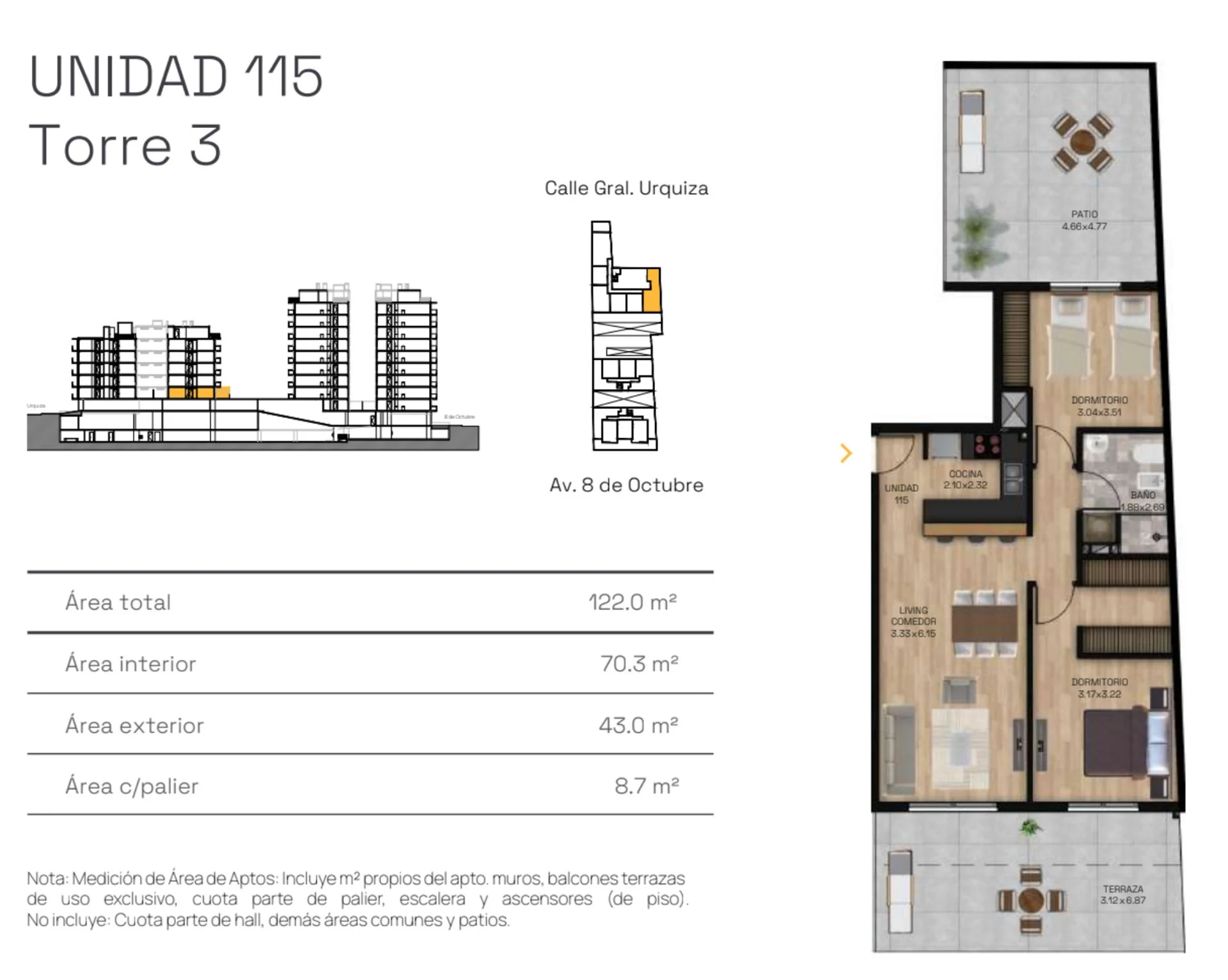 Corredor Responsable: - Contacto: Andrea Goldberg Lanzamiento del edificio \\\"Infinito\\\" El mismo se encontrará ubicado sobre la Av. 8 de Octubre entre Berro y Garibaldi. Una zona llena de servicios, tanto de salud como educativos, y gastronómico. Al mismo tiempo con enorme conectividad a todos los puntos estratégicos de la ciudad de Montevideo, como también del país ya que está a pocas cuadras de la terminar de ómnibus de tres cruces. El edificio Infinito, contará con dos bloques de vivienda, oficina y consultorio. Los bloques uno con frente a la Av. 8 de Octubre, y el otro con frente a la calle Urquiza. La unidad en venta esta ubicada el piso 1, consta de dos dormitorios, un baño y cocina integrada. Lo interesante de esta unidad es que cuenta con una terraza con salida desde el living comedor y uno de los dormitorios sale a otro patio. Se entrega con placares en dormitorios, muebles bajo mesada y aéreo en cocina, previsión de aire acondicionado en los cuatro ambientes y persianas eléctricas Se destaca en este emprendimiento la enorme capacidad de estacionamiento vehicular, y los amenities de primer nivel Todos los beneficios fiscales de la Ley de Promoción de Vivienda Compartimos con todos los colegas inmobiliarios del mercado Comisión inmobiliaria 3% + IVA Gastos conexión 4% Garajes disponibles por USD 22.000 Edificio construido por el arquitecto Lipatin Cada Oficina es de propiedad, gestión y desarrollo independiente La presente publicación describe las características esenciales del inmueble, debiéndose consultar al responsable de la operación por la eventual actualización de las medidas, descripciones arquitectónicas y funcionales, servicios, impuestos, precios y demás información, cuyos valores son aproximados.