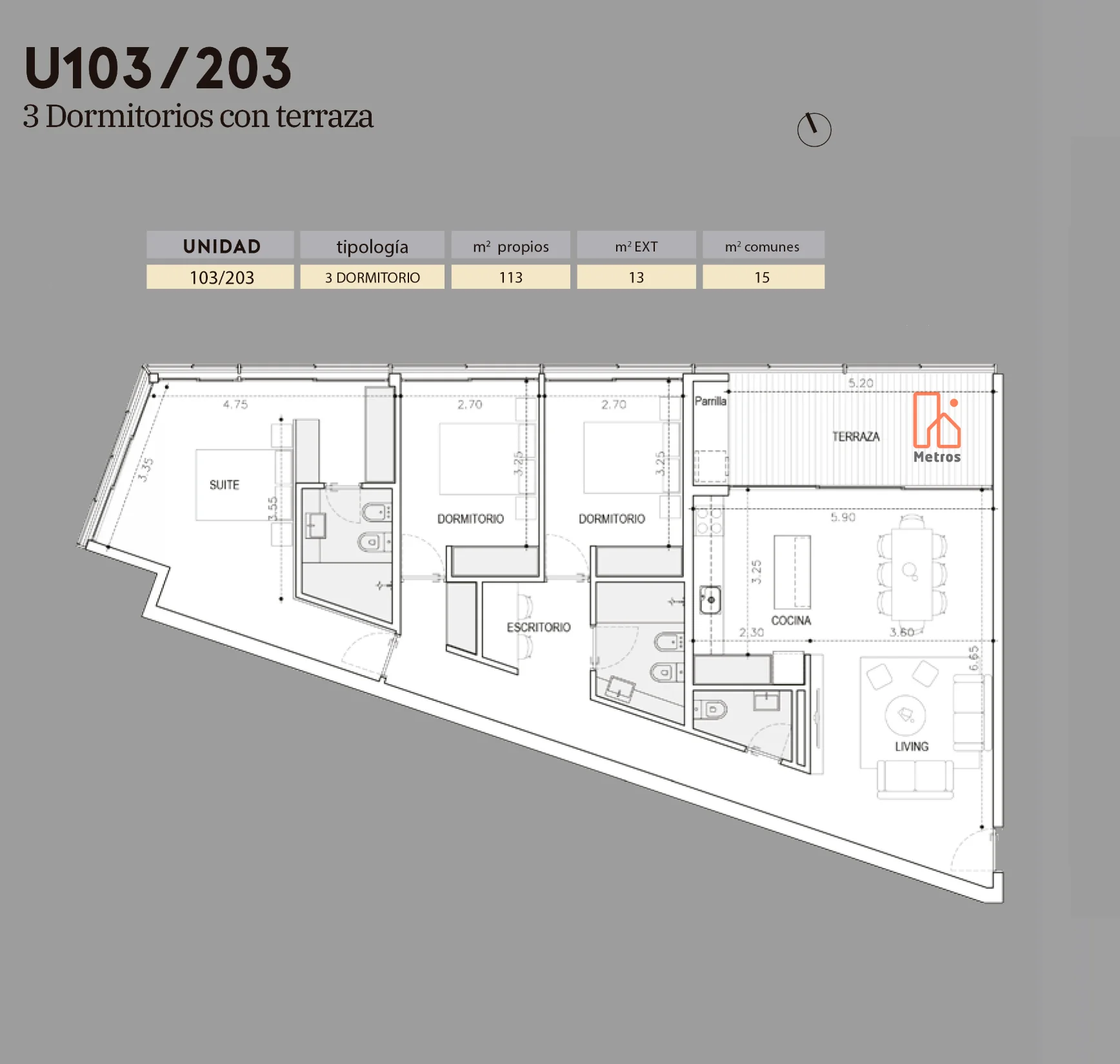 Cuenta con 113 m² totales, donde 13m2 son de terraza.