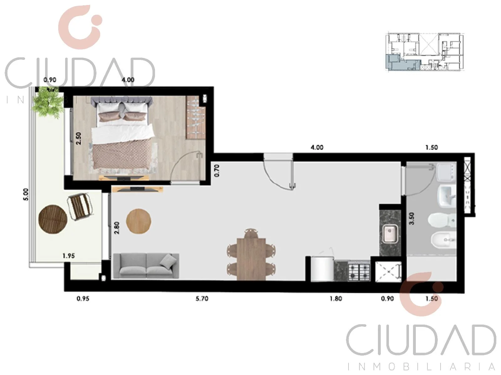 Living comedor con terraza, Dormitorio con Placard, Baño completo y Cocina integrada con placares, Mesada de granito, Grifería de calidad, Campana extractora de aire instalada. GARAJE INCLUIDO EN EL PRECIO