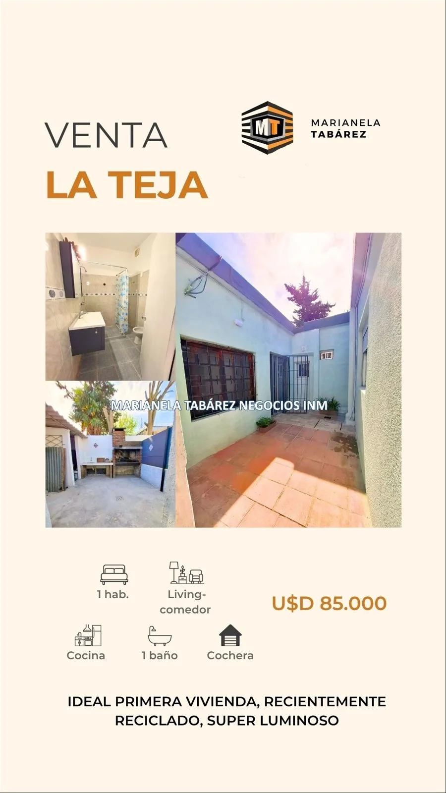 VENTA – Apartamento 1 dormitorio en Planta Baja (La Teja) Funcionalidad, comodidad y gran ubicación ? Barrio La Teja – Montevideo Con parada de ómnibus a pocos pasos y excelente conexión. Características: 1 dormitorio Amplio living comedor Cocina definida Baño completo Patio con parrillero Cochera Muy luminoso Precio: USD 85.000 Acepta financiación directa (consultar condiciones) Cel: 093 313 750 Inmobiliaria Marianela Tabárez Un apartamento con todas las comodidades y un lindo patio para disfrutar. ¡Oportunidad imperdible en La Teja! (CW241608)