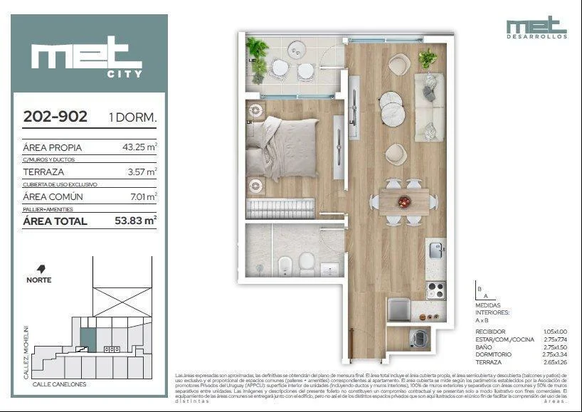 CASASWEB(240300) Proyecto: MET CityDirección: Canelones 1200Fecha de entrega: Diciembre 2026Desarrollista: MET DesarrollosUnidad: 302Ubicado en el Centro de Montevideo, a pasos de Av. 18 de Julio, en una zona hiperconectada, donde te facilita la logística cotidiana, con todos los servicios a mano y a su vez muy cerca del escape de la Rambla.Edificio de exclusivo diseño y arquitectura atemporal, de rasgos modernos en el punto más céntrico de Montevideo. Una opción diferente, ideal para vivir como para invertir. MET City combina la practicidad de la vida urbana con el confort de disponer de una amplia variedad de servicios dentro del propio edificio.Amenities y servicios: Piscina con vista panorámica, Deck solarium, 2 barbacoas con cocina y parrilla, barbacoa exterior con pérgola, área de juegos para niños, gimnasio con maquinas de ultima generación, terraza zen con fire pits, equipamiento para ejercicios de calistenia, laundry con app, bici-parking, pick-up lockers, sistema CCTV, área exterior con cancha multideportiva, mostrador de recepción y co-work con estación de servicios y mesa colectiva.El proyecto se realiza al amparo de la Ley 18.795, Ley de Vivienda Promovida (Vivienda Social) por lo que cuenta con:- Exoneración del ITP- Exoneración de IRAE/IRPF a las rentas generadas de los alquileres por 10 años- Exoneración del IP por 10 añosGarages disponibles desde USD 21.859Gastos de ocupación 4%Honorarios inmobiliarios 3% más IVA Ver mas detalles en casasweb.com?240300