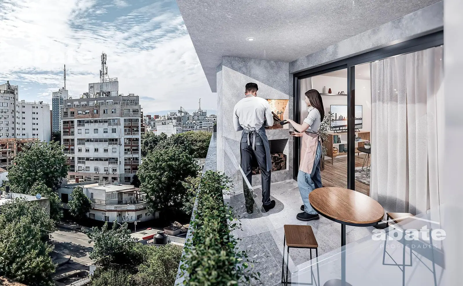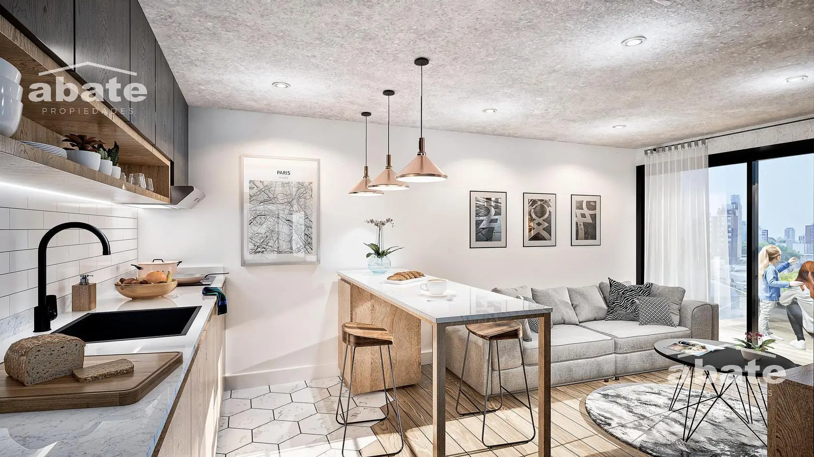 Apartamento con cocina integrada con mobiliario de melamínico tanto puertas como los cajones. El material de las mesada de la cocina será de Cuarzo Italiano. Living comedor con salida a terraza con parrillero de uso exclusivo. 1 dormitorio. Baño completo.