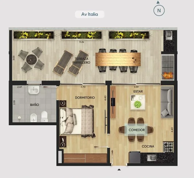 - Amplias terrazas con parrillero