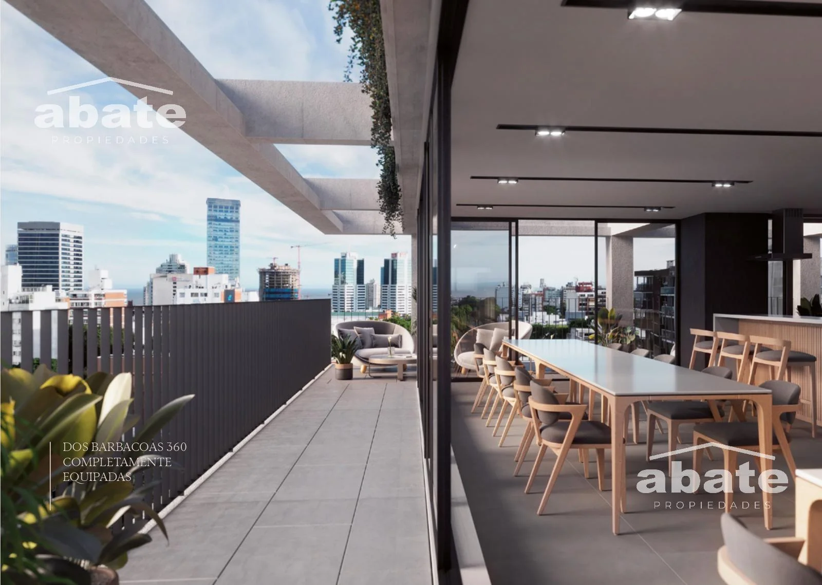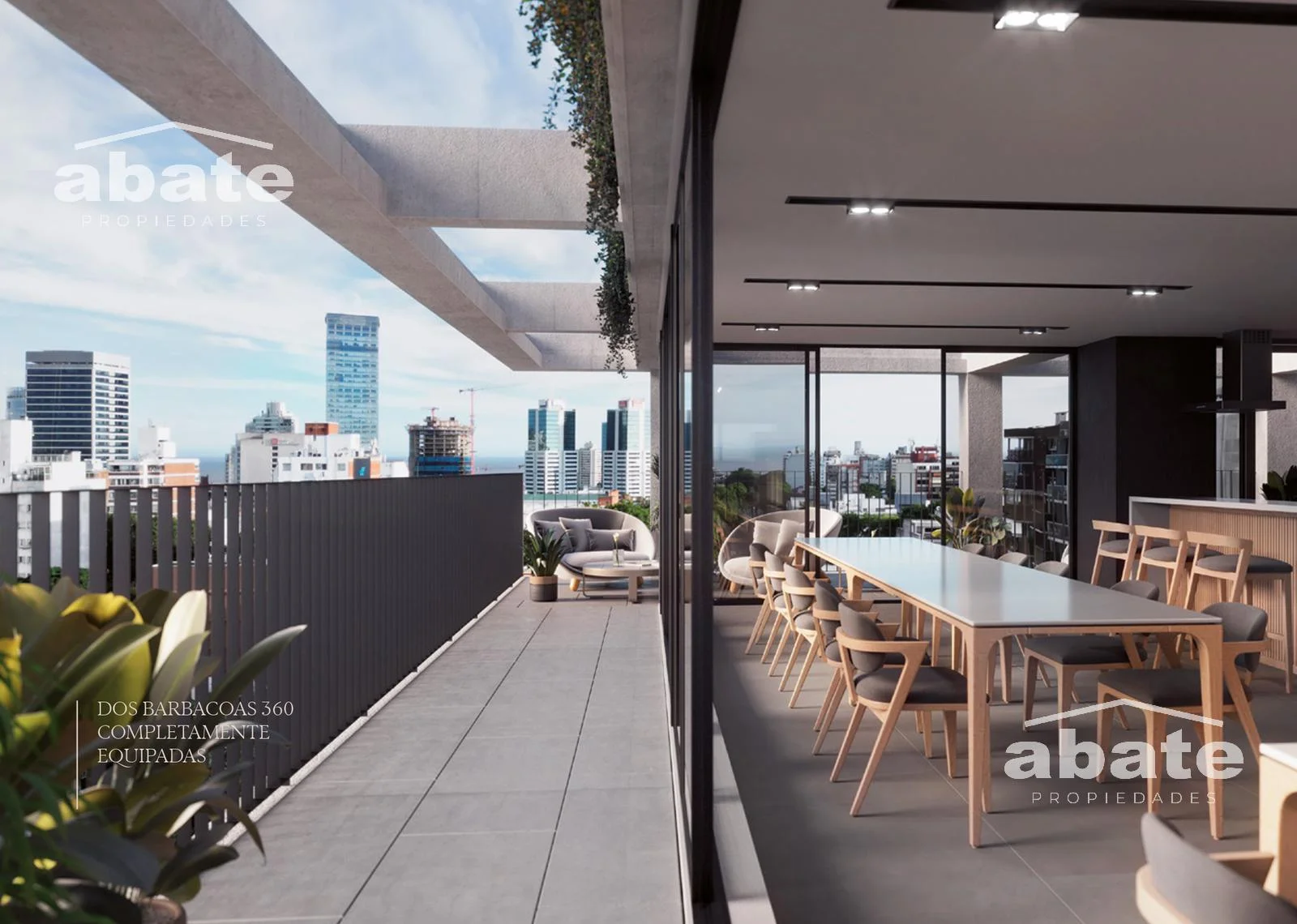 Sala de reuniones y cowork con open kitchen integrado a terraza in-out.