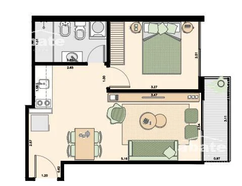 Apartamento living comedor con acceso a terraza de uso exclusivo, cocina integrada equipada con mueble bajo mesada, mueble aéreo, anafe, campana y horno de empotrar. Dormitorio con Placar con hoja batiente. Baño completo.