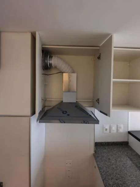 Cocina integrada muy práctica con campana instalada, muebles aéreos y bajo mesada.