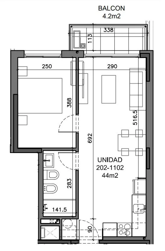 Unidad 1002 - Apartamento que cuenta con 48 m2 totales, compuesto por un living comedor con salida a terraza y cocina integrada, baño y 1 dormitorio.