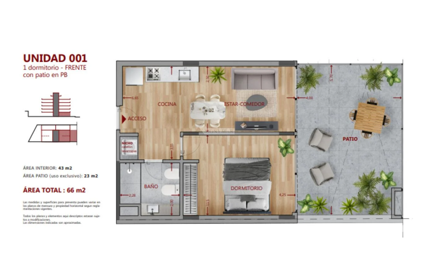 001) 43m2 Construidos + 23m2 de Patio = 66m2 Totales.