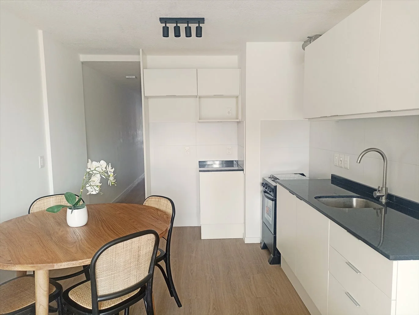 Cocinas integradas con muebles completos bajo mesada y aéreos en MDF meláminico. Mesadas de granito y pileta en acero inoxidable. Mueble para lavarropas y calefón independiente.