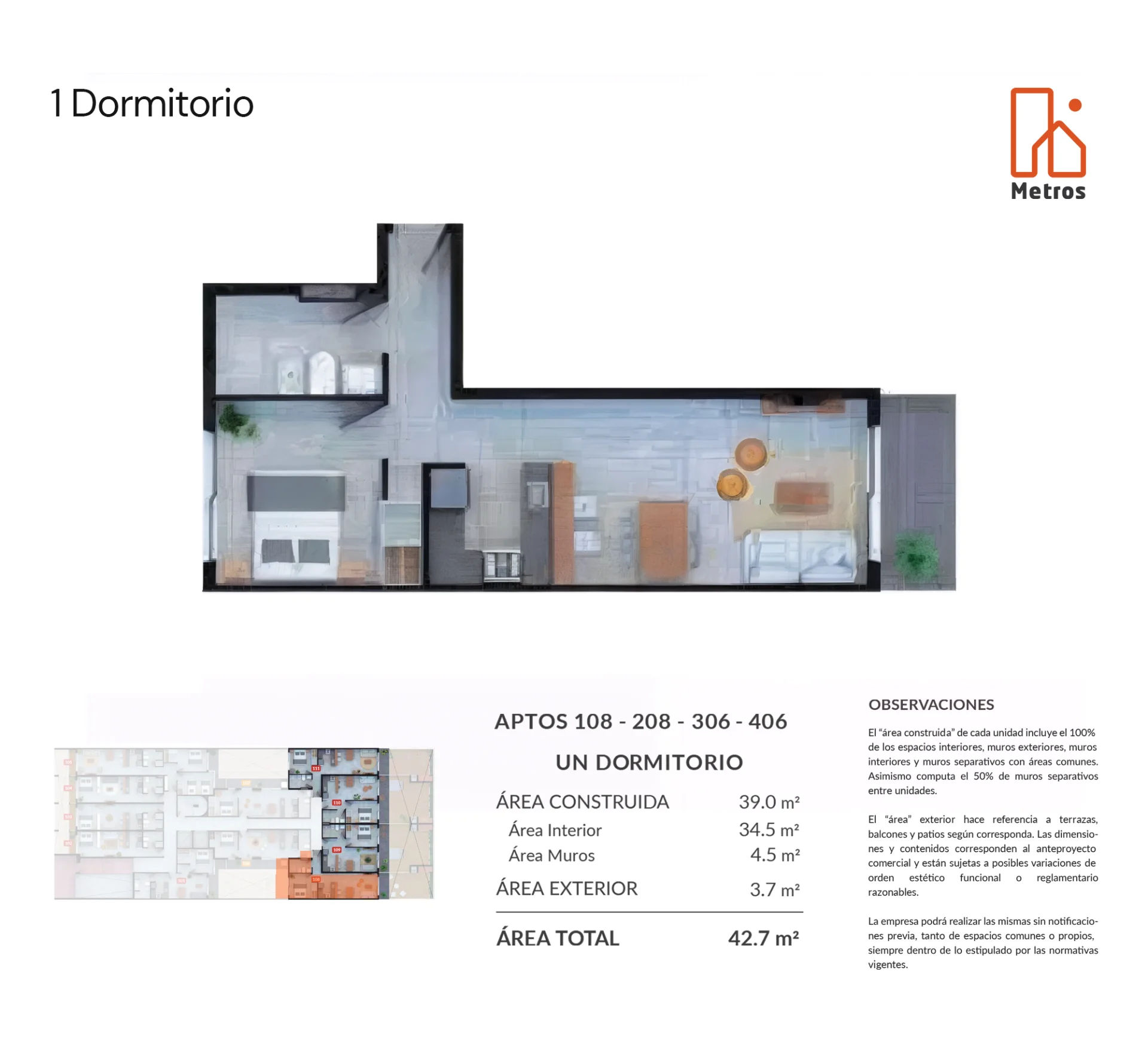 DESTACAMOS Terraza • Construcción Tradicional (SIN yeso) • ¡NO pagas gastos de ocupación ni conexiones! • Ubicación excepcional con todas las comodidades LA ZONA Punto privilegiado a 2 cuadras de Ellauri y de Bv. Artigas. Cerca de la rambla y del Parque Villa Biarritz, ideal para hacer deporte y actividades al aire libre. ¡Todas las comodidades y excelente conectividad! Todos los servicios a tu alcance sin necesidad de moverse en auto, todo a menos de 3 cuadras: supermercados, shopping, universidades, centros educativos y deportivos, gastronomía y más. Una zona comercial muy solicitada con todo lo que necesitas cerca. EL EDIFICIO - RU Un edificio de 5 pisos, de apartamentos monoambientes, 1 y 2 dormitorios. Construido con materiales de alta calidad y diseño, en el mejor punto de Punta Carretas. Entrega estimada Octubre 2026. Cuenta con 2 Barbacoas en azotea con parrillero y terrazas + Solarium • Gimnasio • Laundry • Seguridad AMBIENTES 1 dormitorio • Living comedor • Terraza • Cocina integrada + desayunador • Baño completo • Garaje opcional EL APARTAMENTO Cuenta con 38m2 totales, 34,5m2 internos + terraza 4m2, ubicado en Piso 2. El living comedor es amplio y cuenta con salida a una linda terraza al contrafrente del edificio. La cocina está integrada al living comedor, incluye muebles de mesada y aéreos de melamínico, como barra desayunador. 1 dormitorio con un gran ventanal que deja entrar mucha luz. Cuenta con placard. La construcción es 100% tradicional (no yeso). Cuenta con Aberturas Aluminio DVH con cortina de aluminio. Los pisos son vinílicos simil madera y en baños y cocina los revestimientos son de porcelanato. Cuenta con previsión para calefones, lavarropas y aire acondicionado. Para el ingreso cada apartamento cuenta con portero eléctrico individual. PRECIOS Y GASTOS Garajes desde U$D 26.600 Gastos Comunes estimados: $4.000 Precios son al Contado (o minimo 80%), incluyen un 5% de descuento aprox. Se puede pagar financiado en cuotas durante la obra, en este caso el precio es superior al precio contado publicado. ¡Sin gastos de ocupación ni conexiones! Comisión Inmobiliaria: 3% + iva ¡Te deseamos suerte en tu búsqueda, y estamos para ayudarte tanto con esta propiedad o también para ayudarte buscando otras opciones en todo el mercado! No dudes en contactarnos. Inmobiliaria Metros Consulta nuestra web y redes sociales para encontrar otras oportunidades. Instagram: metros.inmobiliaria
