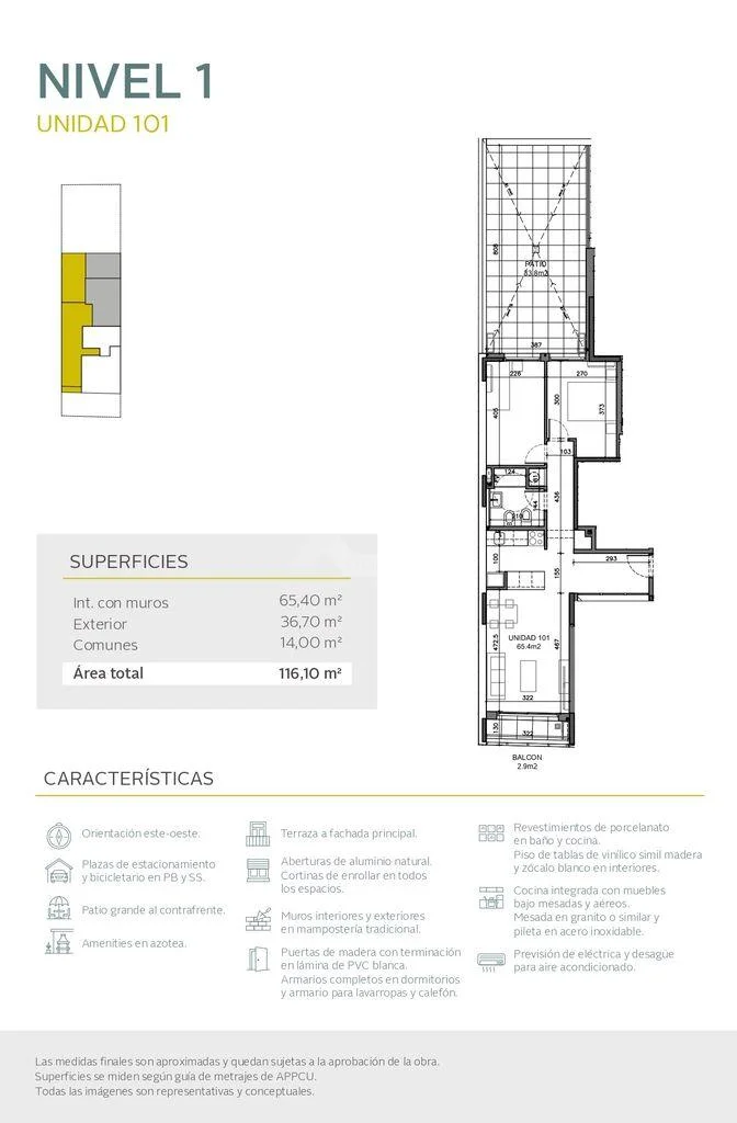 65,40m2 área propia c/muros + 14m2 área común + 36,70m2 terraza = 116,10m2 totales.