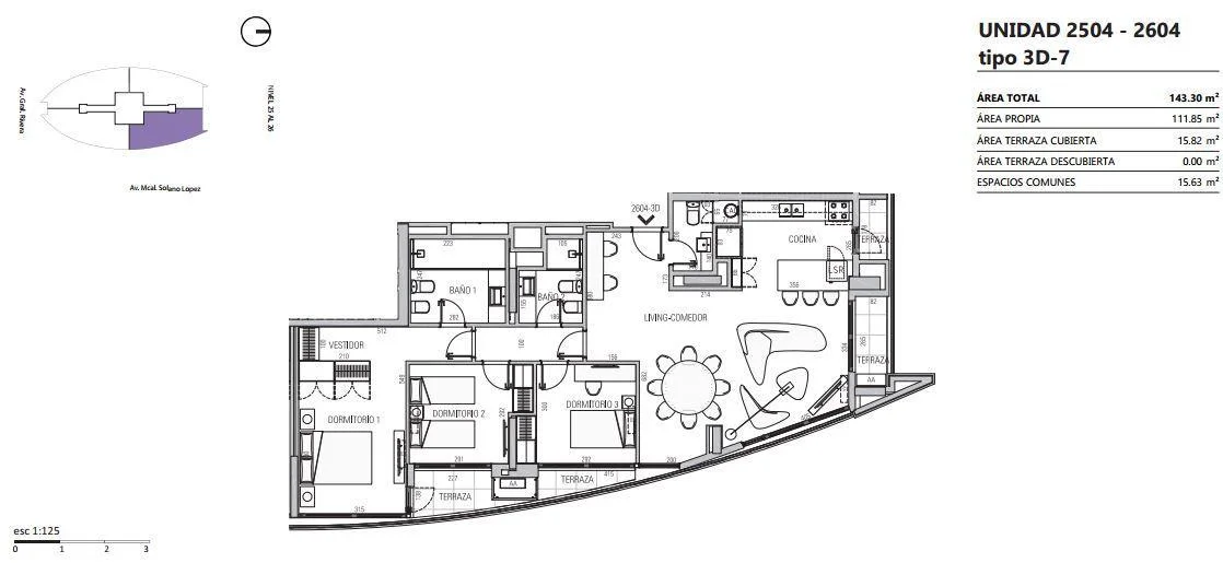 Los apartamentos de 3 dormitorios se destacan por sus ambientes amplios, funcionales y llenos de luz natural gracias al diseño ovalado del edificio.