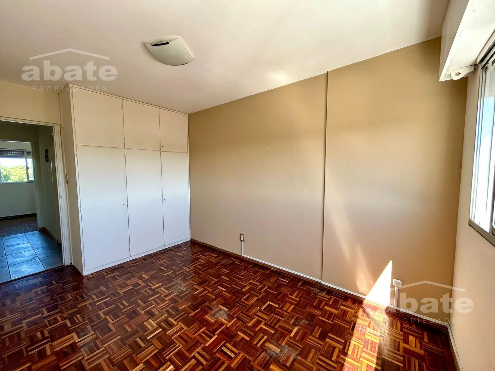Dos dormitorios uno al frente y otro al contrafrente placares empotrados y piso de parqué, baño completo.
