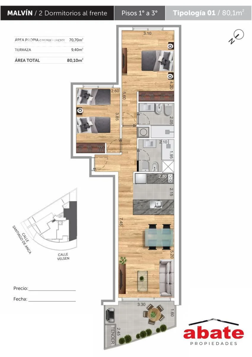 Incluye living comedor con cocina integrada y ventanal de piso a techo que conecta con una generosa terraza al frente de más de 9 metros cuadrados con orientación norte. Desde el pasillo distribuidor se accede a sus 2 baños y 2 cómodos dormitorios, uno de los cuales incluye el baño en suite.