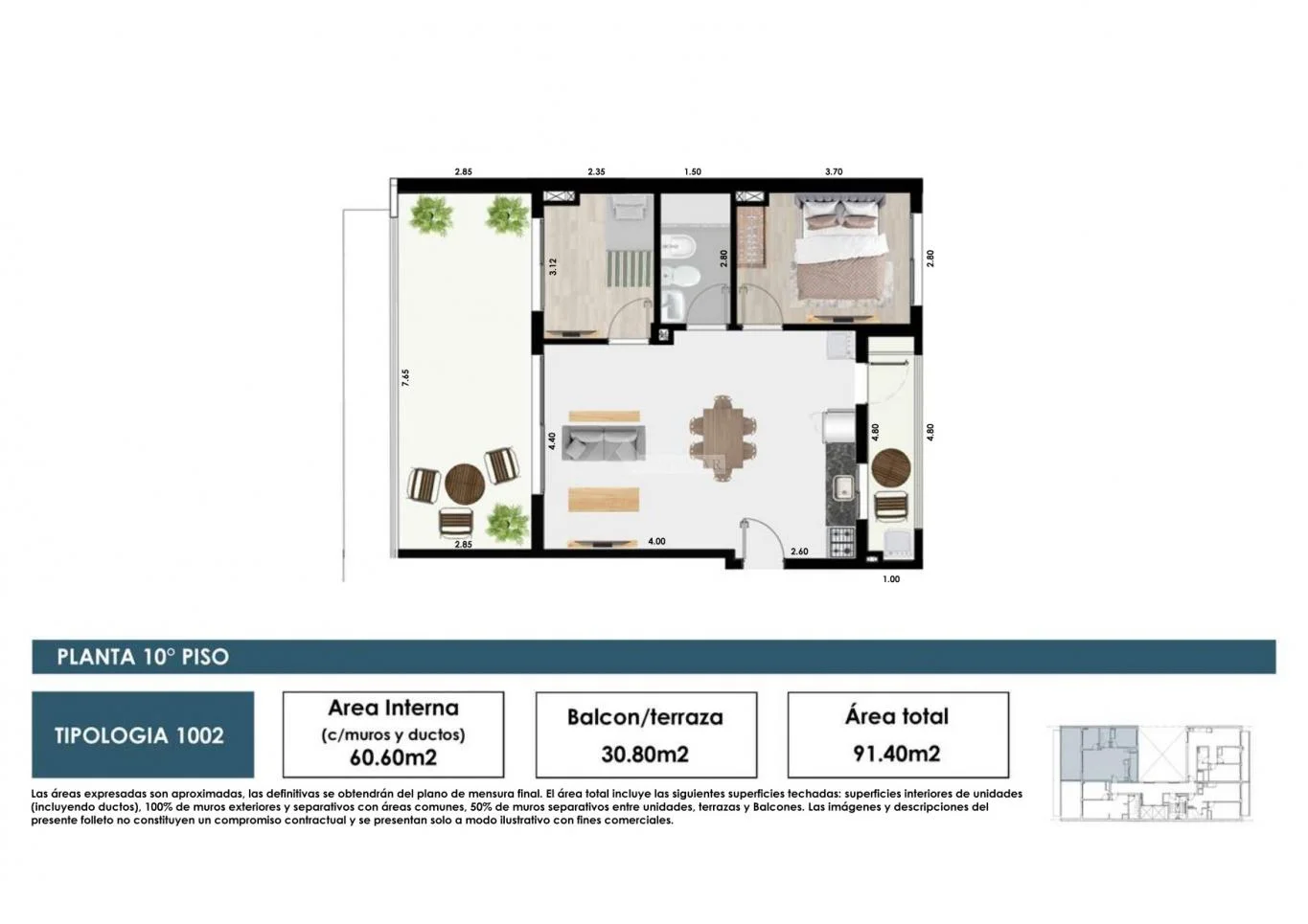 1002) 60,60m área propia + 30,80m terraza = 91,40m Total.