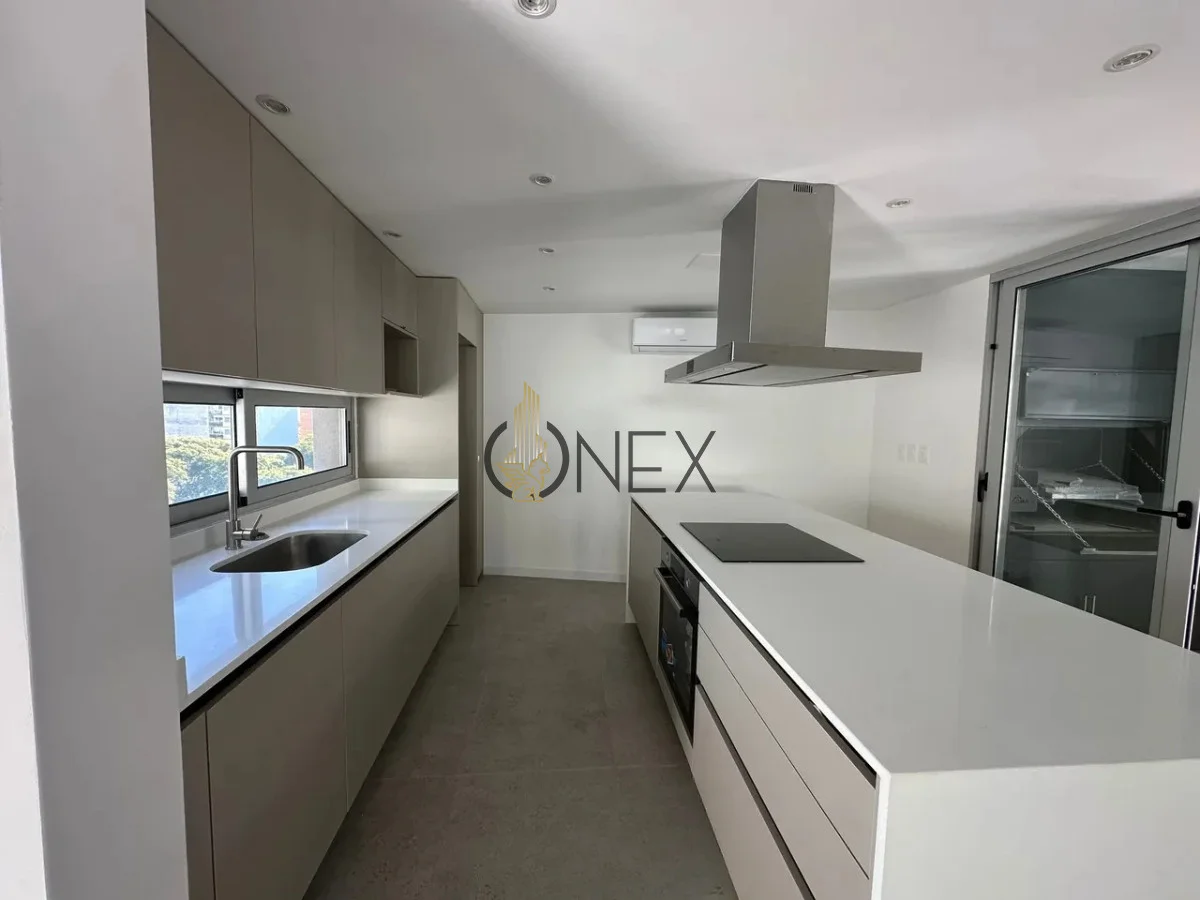 Cocina: Integrada con isla y equipada con campana, anafe y horno eléctrico.