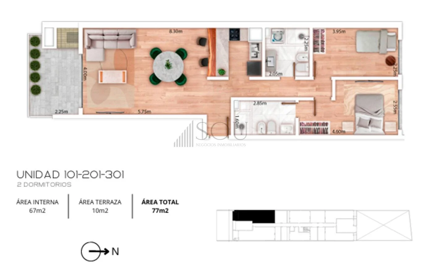 Apartamento en Venta, 2 dormitorios, dos baños. Luminoso con salida a terraza