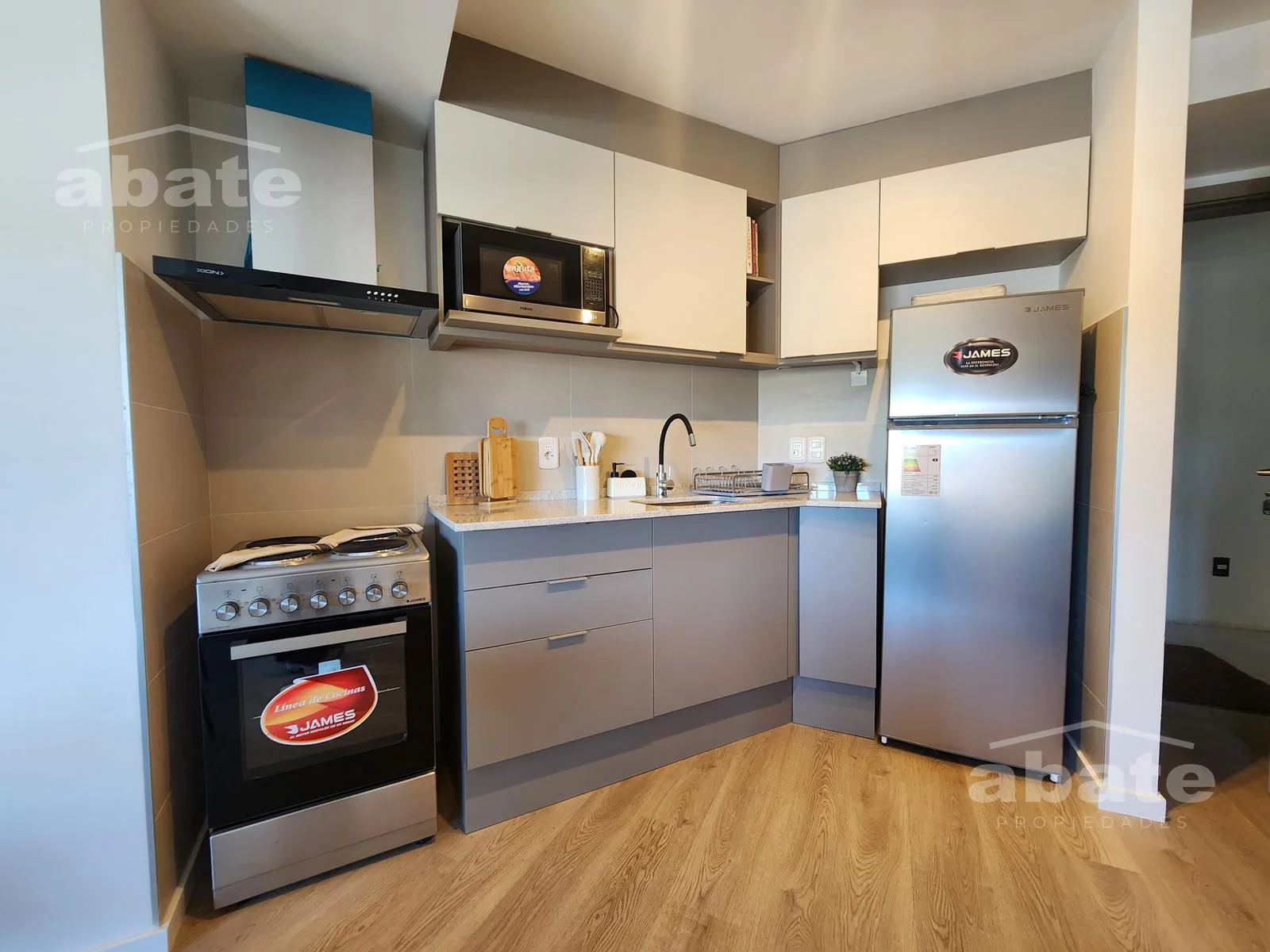 Al ingresar a este moderno apartamento se encuentra un espacio recibidor seguido por la cocina integrada, equipada con muebles bajo y sobre mesada y campana extractora.