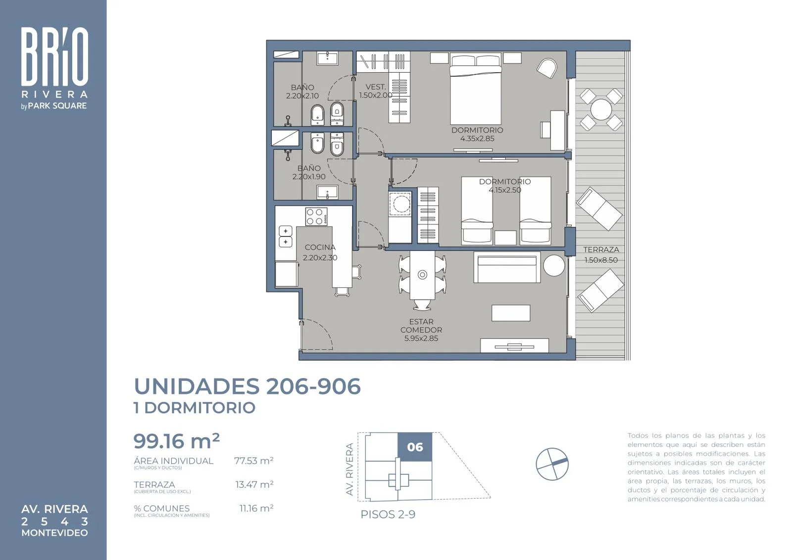 Brio Rivera se compone de 52 apartamentos, con 33 unidades de 1 dormitorio y 19 unidades de 2 dormitorios, diseñados con distribución eficiente, amplias aberturas que favorecen la iluminación natural y terminaciones de calidad. El proyecto se ubica sobre Rivera esquina Obligado, en una ubicación estratégica dentro del barrio.