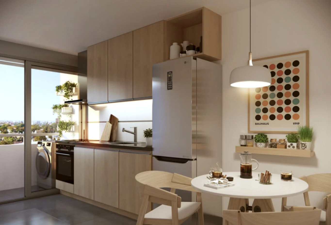 Cocinas equipadas con anafe y campana; las unidades de 2 dormitorios suman horno empotrado y lavadero.