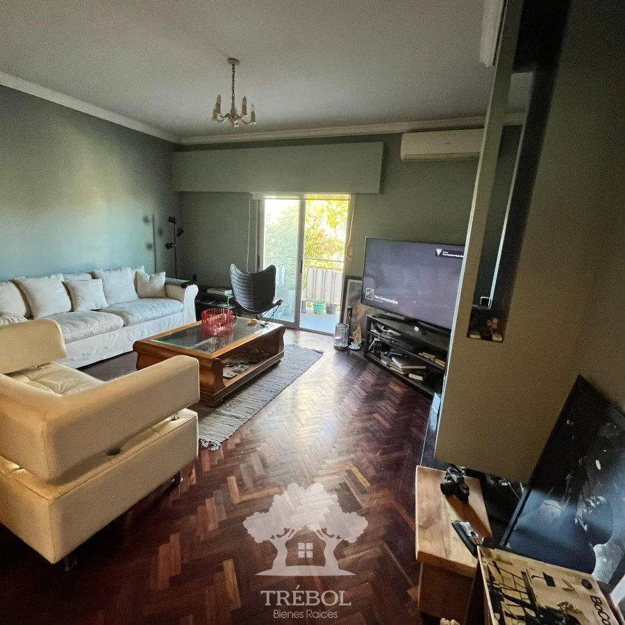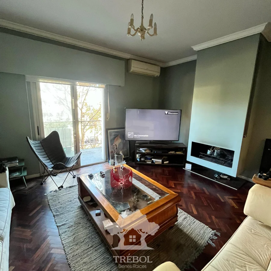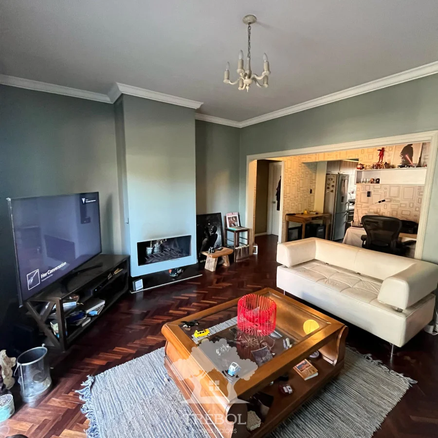- Living comedor amplio, piso de parquet, estufa a leña y salida a balcón al frente.