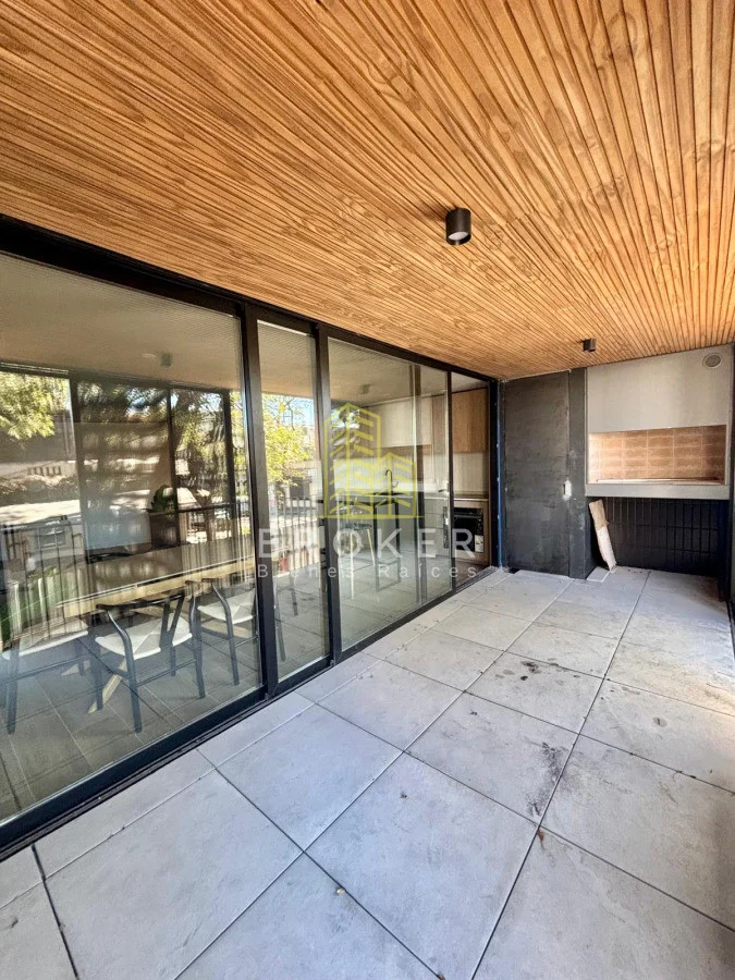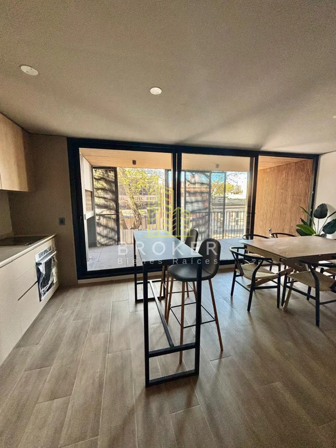 Living comedor con cocina integrada y terraza grande con parrillero al frente.