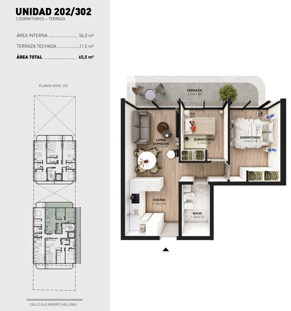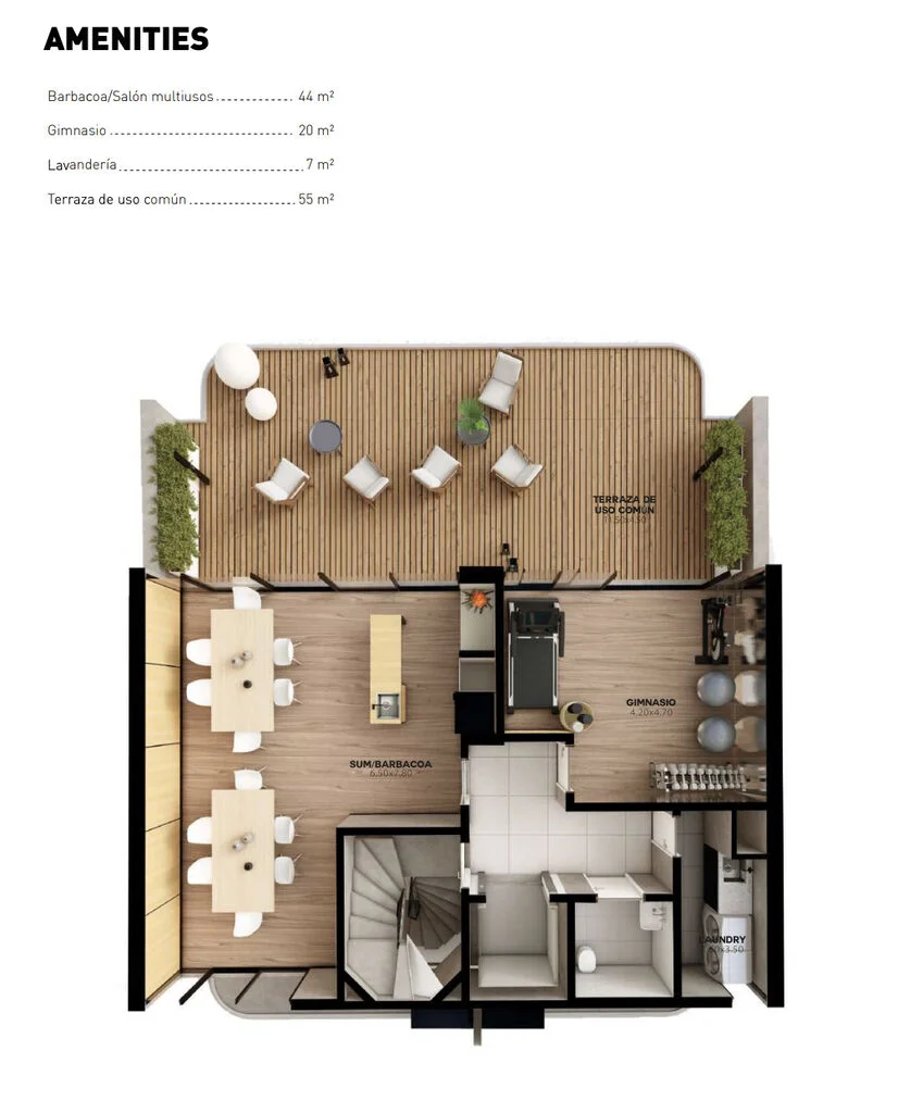 El proyecto cuenta con dos bloques: uno principal de seis niveles con garajes y otro más pequeño de tres niveles con amenities como barbacoa, gimnasio y lavandería.